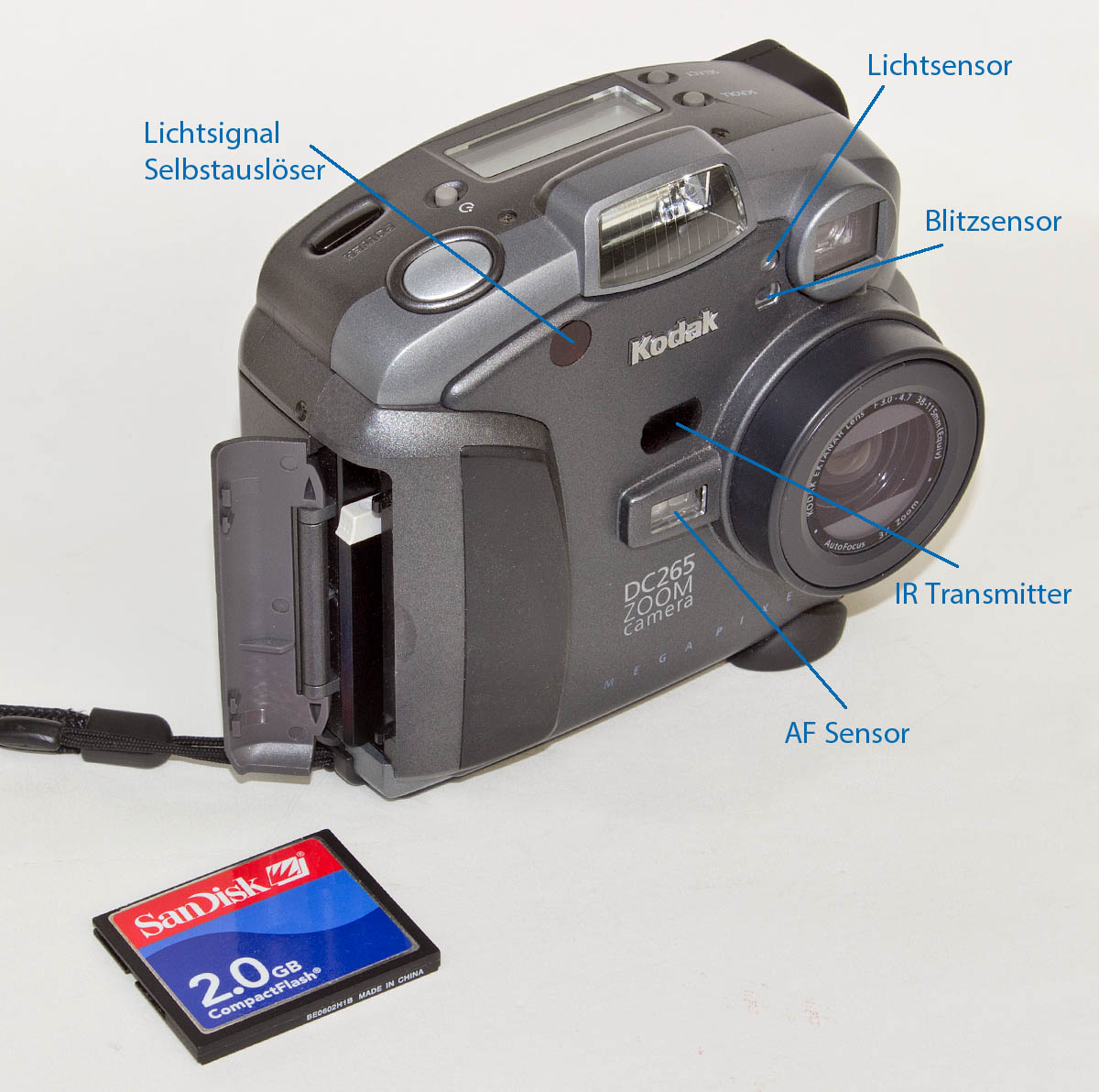 Der CF I Kartenslot und die zahlreichen Sensorfenster an der Vorderseite der Kamera