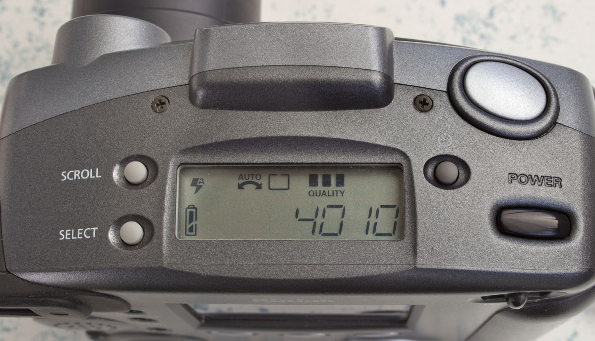 Das Datendisplay auf der Oberseite zeigt den Betriebsmodus, die noch freie Bildanzahl und bei manueller Einstellung die Werte von Blende und Belichtungszeit