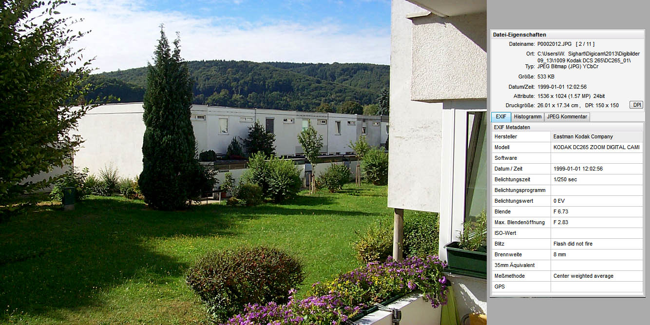 Eine Weitwinkel-Testaufnahme bei voller Sonne und die Exif Daten der Aufnahme (Verkleinert - Originalgröße 1536x1024 Pixel, Qualität: Best)