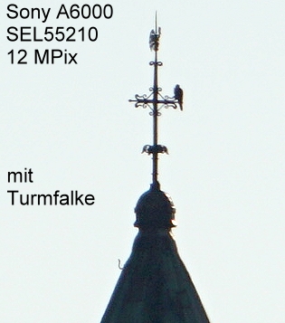 1:1 Ausschnitt bei 12 MPix-Auflösung. Man beachte den Turmfalken. Schwach mit Unschärfe-Maske behandelt.