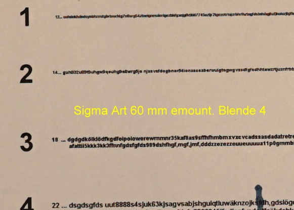 Vergleiche ich das Sigma Art 60 mm / 2,8 emount mit dem Sigma 30 mm u. Sigma 19 mm ebenfalls Art emount, dann scheint mir des 60 mm leicht vorn zu liegen (Jammern auf hohem Nieveau).