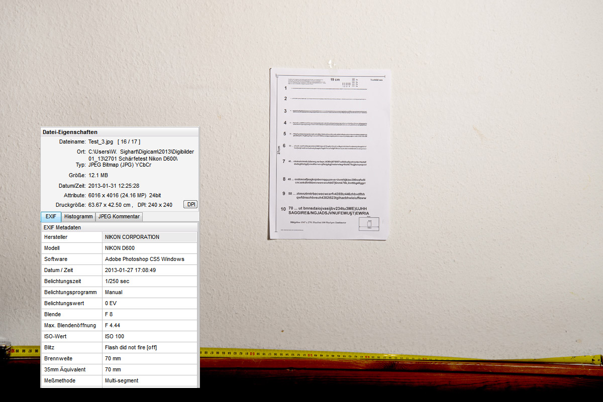 Mein Sohn hat jetzt dienstlich eine Nikon D600 mit 24 Mp, die wir auf die Schärfe und Auflösung getestet aben.