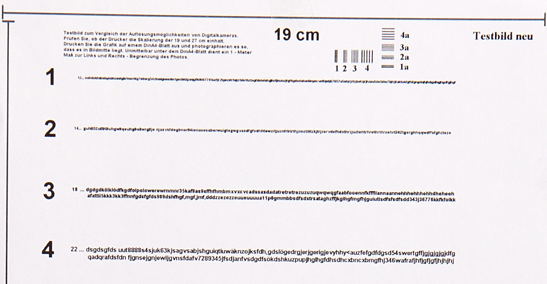 Ich hatte mal mit dem Nutzer DD6JV diese Testmethode entwickelt, um hier Kamera Auflösungen in etwa vergleichbar hinzubekommen. Wenn genau die Aufnahmebedingungen und die Ausdruckgröße eingehalten werden, ist tatsächlich eine gewisse Vergleichbarkeit gegeben.