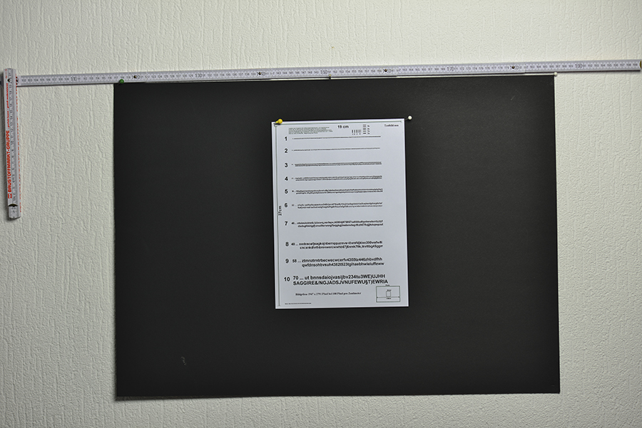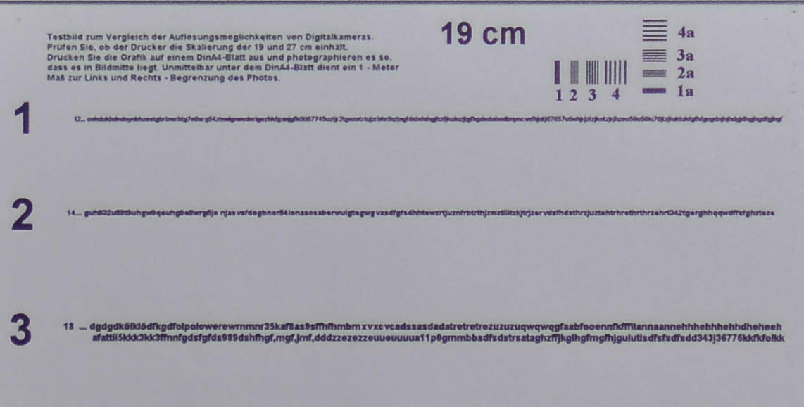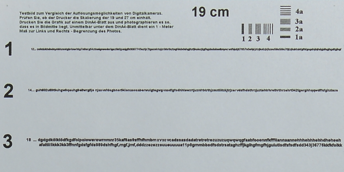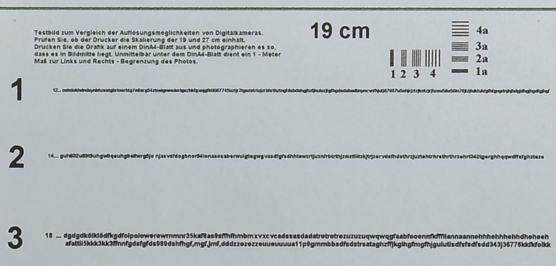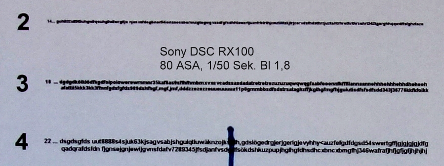 hier der 2, Anlauf mit nur noch einem Objektiv, dem 1,8/85mm Nikkor, dafür in 3 Blendenstufen ( 1,8/3,5/8). Die Kamera war exakt auf die Blattmitte und in waagerechter und senkrechter Achse ausgerichtet (dank eingebauter Nivelieranzeige kein Problem) nur das Testbild habe ich nicht 100%ig gerade an die Wand gepinnt. Aber das dürfte für den Test unerheblich sein.