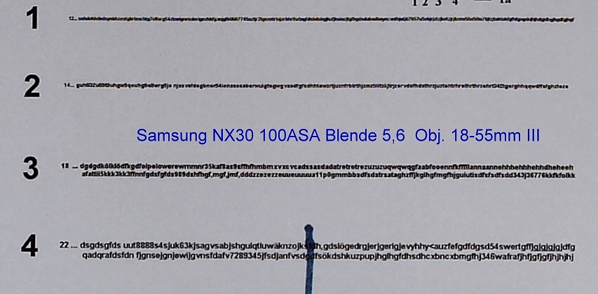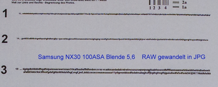 hier das Testbild der Samsung NX30. Ich habe 4 Photos auf Stativ mit Selbstauslöser und ohne Bildstabilisator bei 100 ASA aufgenommen: Blende 3,5 / Blende 4,5 / Blende 5,6 / Bende 8