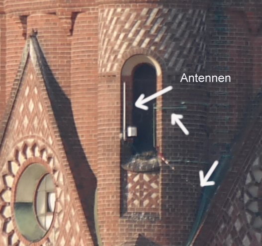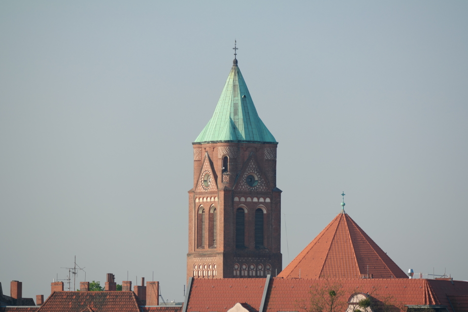 Zu sehen ist die katholische Spandauer Kirche St. Marien. Oben am Turm sind u.a. einige Amateurfunkantennen zu sehen. Die Kirche befindet sich in 535 Meter Entfernung von der Kamera.