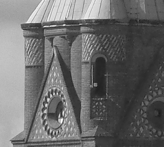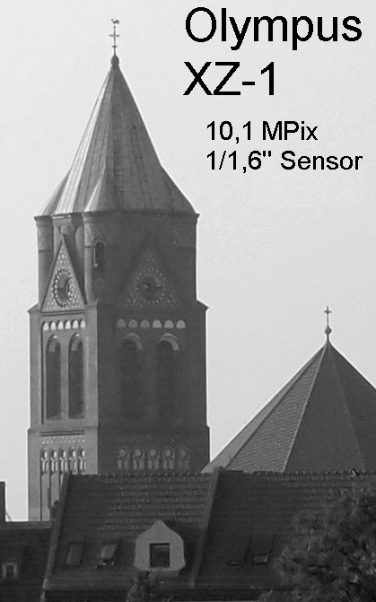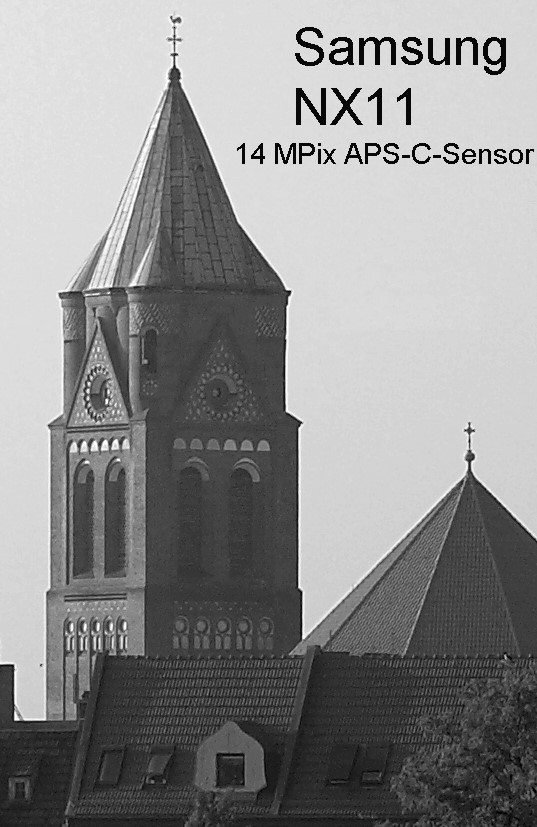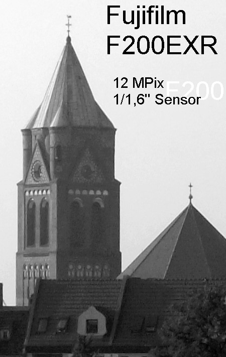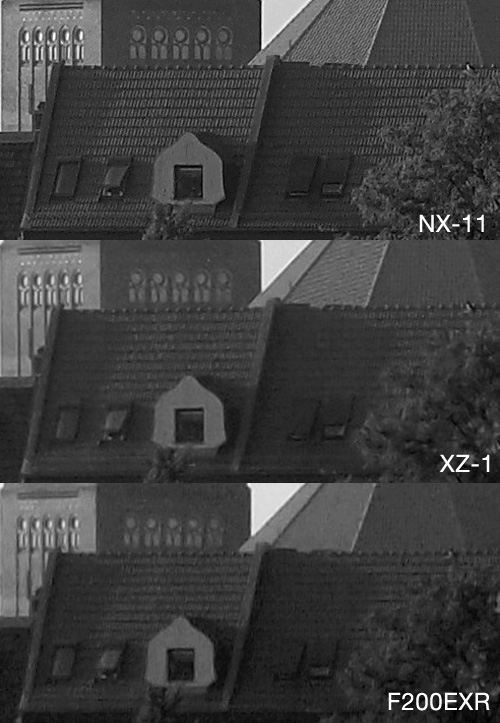 Ein interessanter Vergleich. Vor allem in den Dachziegeln ist neben der besseren Auflösung des großen APS-Chips gut sichtbar, dass enorm viele Details durch die jpeg-Kompression verloren gehen. In der pyramidenförmigen Dachfläche rechts oben ist das besonders gut sichtbar- von jedem Ziegel bei der Samsung bis zur fast strukturlosen grauen Fläche der Fuji. Hier wäre ein Vergleich im RAW oder TIFF Format interessant (wenn es die Kameras können?).