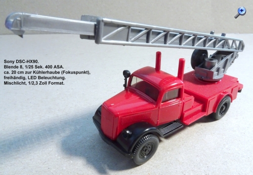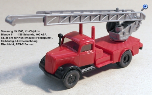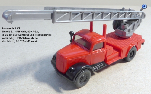 Ich habe bei vier Kameras mal wieder einen Test gemacht und ein kleines Wiking Feuerwehrauto so aufgenommen, dass das Motiv eine Tiefenstaffelung hat. Der Autofokuspunkt der Kameras habe ich dabei versucht auf den Kühlervorbau zu legen.