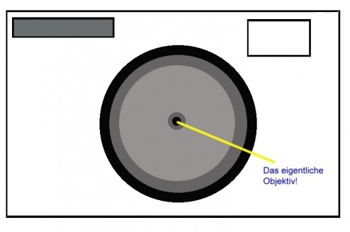 Der "Objektiv"-Vorbau will auf groß und gediegen abstellen. Sogar Schein-Frontlinsen, die eigentlich nur Glasscheiben sind, habe ich so interpretiert. Ein genauer Blick zeigt in der Mitte der "Objektiv-Riesen" ein kleines winziges wirkliches Objektiv-chen, so wie oft bei Smartphones üblich. Das muss ja nicht schlecht sein, aber warum dann darum herum der Prachtbau einer "Objektiv"-Attrappe? Aussehen wie ein Superzoom, aber nur eine Murkel-Festbrennweite mit vielleicht Digitalzoom? 15-facher Digital-Zoom, ach ja ...