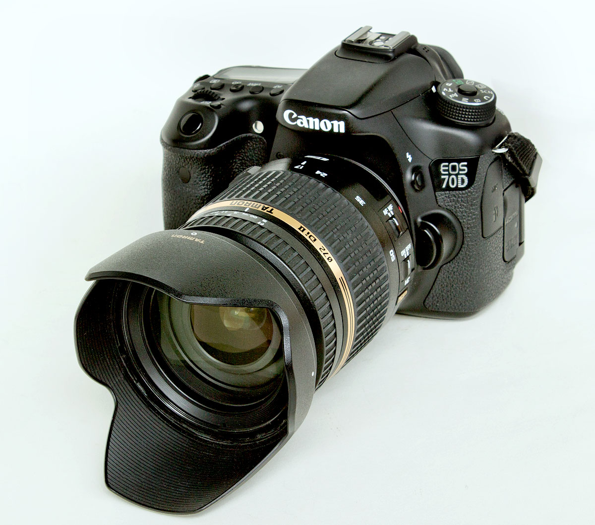 Typ: Digitale Spiegelreflexkamera mit Wechselobjektiv Modell: Canon EOS 70 D Hersteller: Canon Inc. Tokyo, Japan Baujahr: 2014 Bildsensor: CMOS, 20,2 Megapixel, 22,5 x 15 mm, KB-Faktor 1,6 Objektiv: Bajonett EF-S, hier Tamron SP AF 17-50 mm, 1:2,8 VC 19 Linsen in 14 Gruppen, Bildwinkel diagonal 78°-31° Entfernungseinstellung: Autofokus, Manuell, 0,29 m - Unendlich Belichtungseinstellung: Div. Automatikprogramme, Manuell Weißabgleich: Automatik oder div. manulle Einstellungen Verschluß: Elektronisch gesteuerter Schlitzverschluß, max. 7 B/sek. 1/8000 - 30 sek. X - Blitzsynchronzeit 1/250 sek. Lichtempfindlichkeit: 100-25.600 ISO Speicherformat: RAW 14 Bit, JPG (div. Qualitätsmodi) Kartenslot: SD (SDHC) Bildmonitor: TFT-LCD, 3", 1.040.000 Pixel, Live View, Touchscreen Blitz: Ausklappbar, TTL Steuerung, Leitzahl 12 bei ISO 100 Videoaufnahme: Full HD, 1920 x 1080 px, 30, 25, 24 B/sek. mit Autofocus während der Aufnahme Stromversorgung: Li-Ionen Akku LP-E6 7,2 V, 1800 mAh Anschlüsse: USB, HDMI, Mic, Kabelauslöser Abmessungen: 139 x 104 x 78 mm (ohne Objektiv) Gewicht: 760 g (ohne Objektiv)