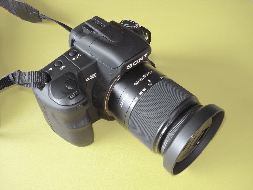 Hesteller, Modell: Sony Alpha 200 Baujahr: 2004 LCD Mon. 6,7x 2,7 cm Zeit 1/4000-30sek. Bildsensor 23,6 x 15,8 mm (DX-Format) ISO 100 – 3200 Blitz eingebaut LZ 12m USB USB2.0 Akku Lioa 11,8Wh Sucher -2,5…+1 Dioptrien Speicher Memory Stick Objektiv 18 – 30
