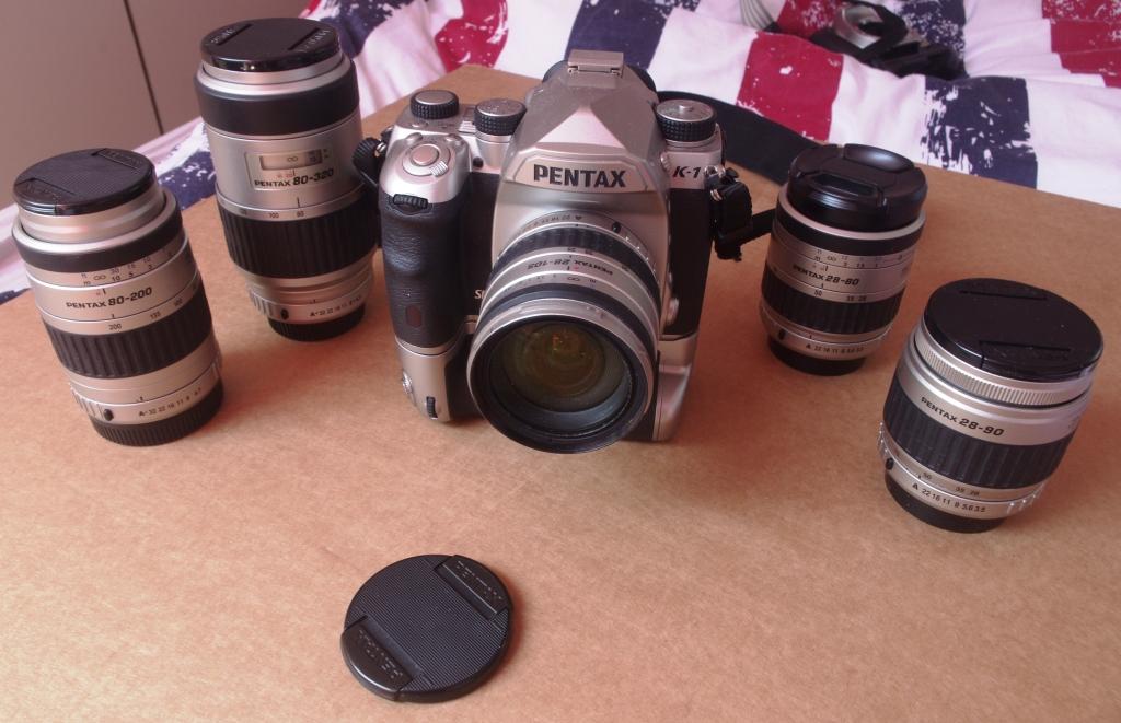 Technische Daten: Typ: Digitale Spiegelreflexkamera mit Wechselobjektiv Modell: Pentax K 1 Baujahr: 2016 Bildsensor: CMOS, 36,4 Megapixel, 35,9 x 24 mm, 7360 x 4912 Pixel Objektivanschluss: Pentax KAF2-Bajonett, mit allen K-Bajonett-Objektiven (auch Fremdhersteller) kompatibel hier gezeigt mit farblich passenden Analog-Objektiven aus den 90ern des vergangenen Jahrhunderts Entfernungseinstellung: Autofokus, (33 Autofokuspunkte, davon 25 Kreuzsensoren) Belichtungseinstellung: Div. Automatikprogramme, Manuell Weißabgleich: Automatik oder div. manuelle Einstellungen Verschluss: Elektronisch gesteuerter Schlitzverschluss, 1/8000 - 30 sek., B, T, X - Blitzsynchronzeit 1/200 sek. Lichtempfindlichkeit: 100-204.800 ISO Speicherformat: RAW 14 Bit PEF/DNG, JPEG (div. Qualitätsmodi) Kartenslot: 2x SD (SDHC, SDXC) Bildmonitor: TFT-LCD, 3,2" (8 cm), flexibel klappbar Blitz: kein eingebauter Blitz Videoaufnahme: Full HD, 1920 x 1080 px, 30, 25, 24 B/sek. mit Ton Stromversorgung: Li-Ionen Akku DLi90 Anschlüsse: USB 2.0, HDMI D, Stereo Mikrophon, Kopfhörer, Kabelauslöser, Blitzbuchse, ext. Stromversorgung Abmessungen: 110 x 136,5 x 85,5 mm (ohne Objektiv) Gewicht: 1010 g (ohne Objektiv, inkl. Akku))