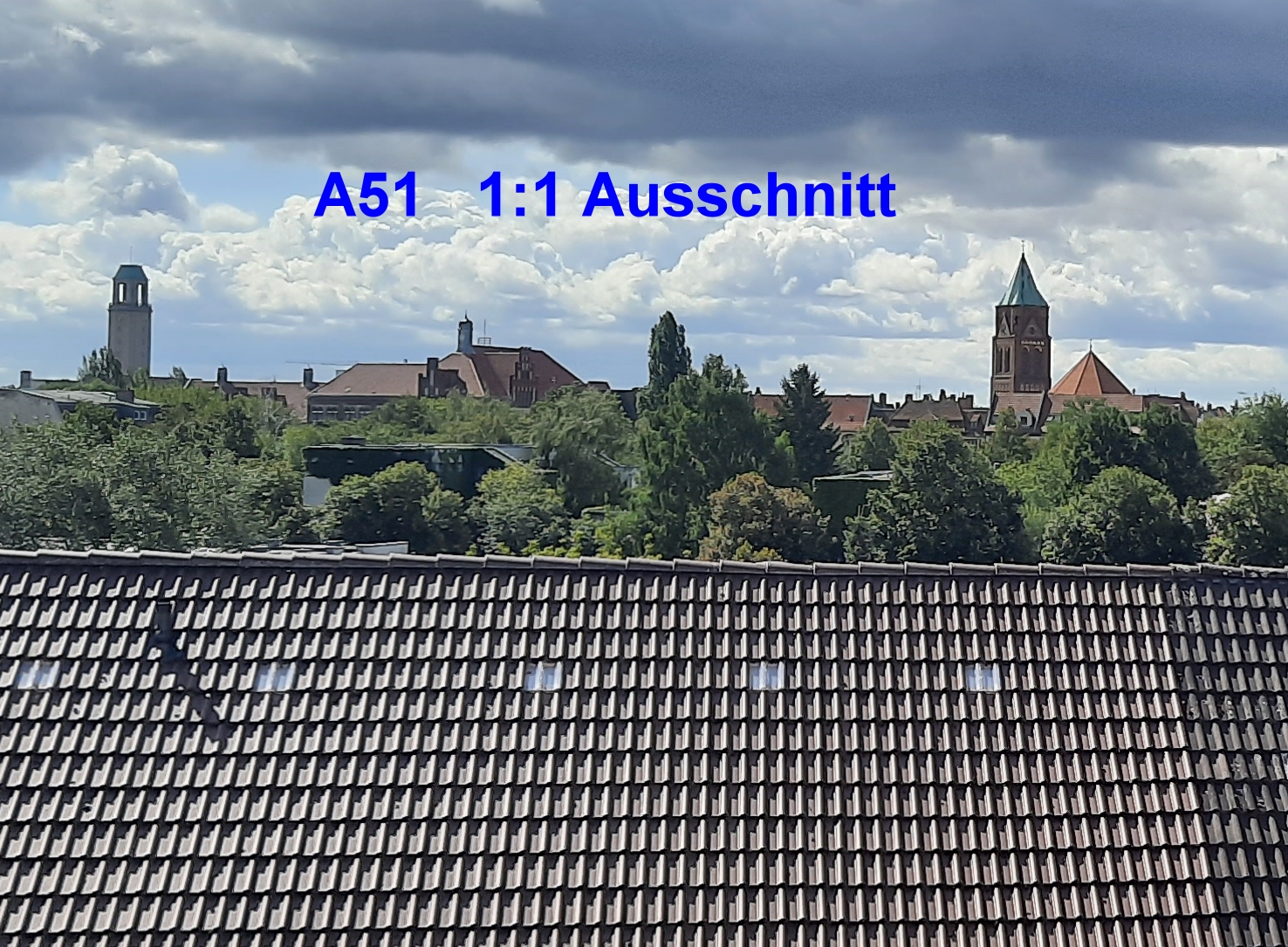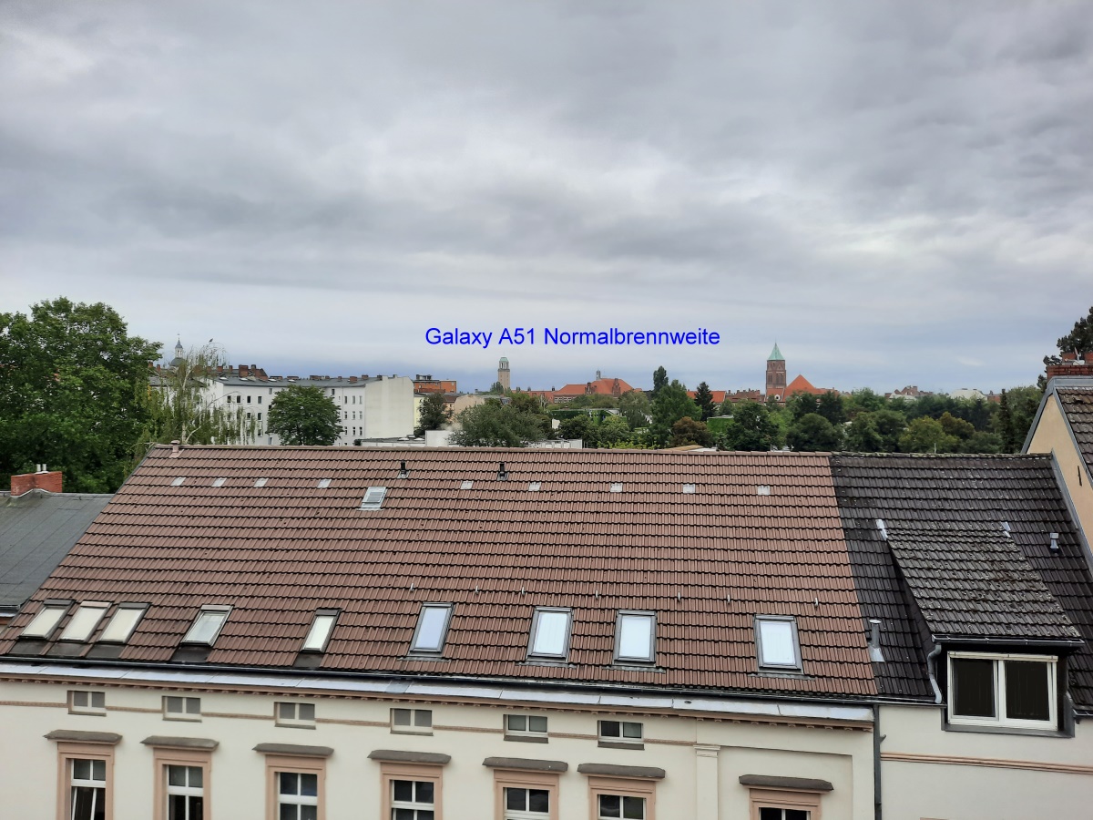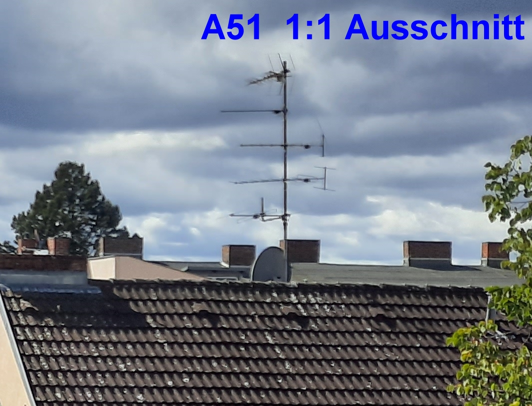 Die folgenden Fotos zeigen den direkten Vergleich. Es sieht so aus, dass die Smartphone-Kamera hinsichtlich der Bildschärfe durchaus mithalten kann, in der Bildmitte ist die A51 Kamera sogar einen Hauch besser, am Rand einen Hauch schlechter. Die teilweise bessere Bildschärfe führe ich aber auch auf eine etwas aggressivere Kantenanschärfung der A51-Kamera-Software zurück. Trotzdem habe ich dieses Ergebnis so nicht erwartet.