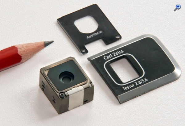 Das 5 Mp Kameramodul mit Autofokus, automatischer Helligkeitsregelung und einschwenkbarem Graufilter. Abmessungen: 15,8x14,7x9 mm, Gewicht: 2,2 g
