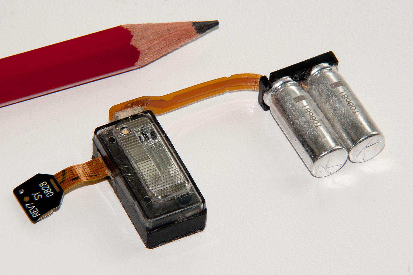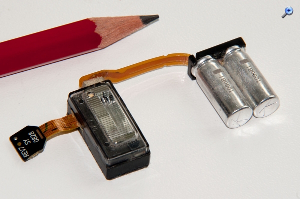 Das Elektronenblitz-Modul mit LED Hilfslicht und den Elektrolytkondensatoren. Abmessungen Blitzmodul: 19,8x9,9x6,2 mm, Elkos: 17,5x12,7x6,2 mm Gesamtgewicht: 4,2 g