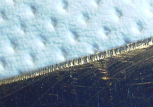 Bei echten Makro-Aufnahmen, die ich bei heutigen kleinen Sensorgrößen mal salopp so definieren möchte, daß ihr Bildfeld 24x36 Millimeter nicht überschreitet, findet die E-990 ihre Grenzen - sie funktionieren nur, wenn man das Zoom auf ungefähr den Mittelwert stellt (eine genaue Definition oder Einstellung gibt es nicht), und auch dann mit einer Zuverlässigkeit, die ich höchstens auf 33 Prozent beziffern möchte. Dabei ist die Nikon E990 schon eine Ausnahme und berühmt für ihre Makrofähigkeit. Eine frühere makrotaugliche Kamera waren die Ricoh RDC-4200 bzw. 4300 und die baugleiche, umgelabelte Philips ESP-80, deren geringster Aufnahmeabstand einen Zentimeter betrug. Bild (Detail von einer Russenleica) von einer Philips ESP-80 wie hier im Forum vorgestellt: https://blende-und-zeit.sirutor-und-comp...p;id=1583405138 Auch RIM00004_640.jpg stammt von der Ricoh und zeigt eine auf rauh geschliffene Messerschneide (wollte die Aufnahme eigentlich wieder löschen, weil die von der Russenleica hübscher ist, aber auch dieses Bild hat ja schon Interesse gefunden).