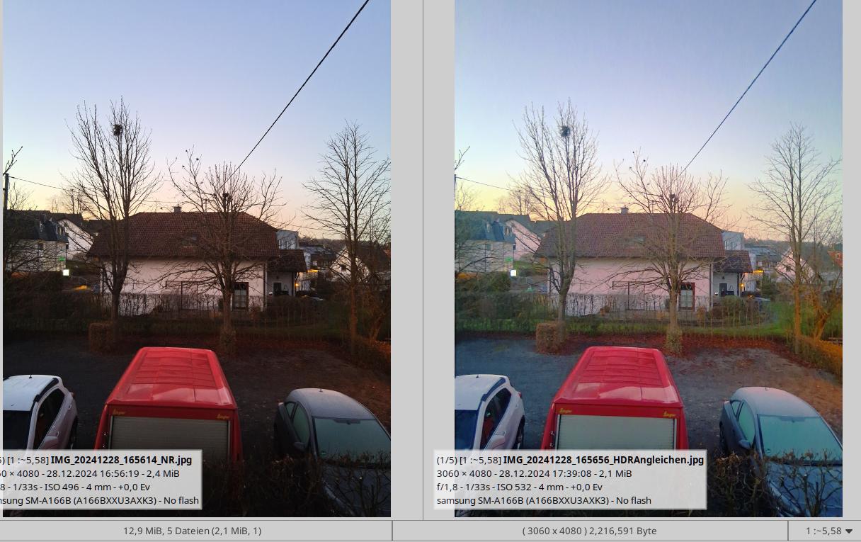 wer's noch nicht kennt, als Nachtrag zu meinem Ausgangsposting auch ein schnelles Beispiel zu HDR. Nacharbeit am PC war notwendig, denn HDR zeigt so eine Neigung zu flauen Bildern oder falschen Farben. Sogar der Autor von Open Camera warnt davor ("HDR can sometimes result in less accurate color reproduction (due to trying to estimate the colors from multiple exposures)"). Ich habe einfach, vor allem der Vergleichbarkeit halber, den Menüpunkt für automatische Kontrast-Angleichung in GThumb angewendet. Links Normalaufnahme, rechts HDR: