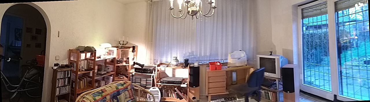 Für kleine Panoramafotos in Internet-Größe ergaben die eingebauten Kamera-Apps akzeptable Resultate. Verkleinertes und geschärftes Testfoto, ursprünglich 2176 x 664 Pixel mit drei der vier Wände fast vollständig drauf, aus einer Messie-Wohnung (ahem ) anbei.