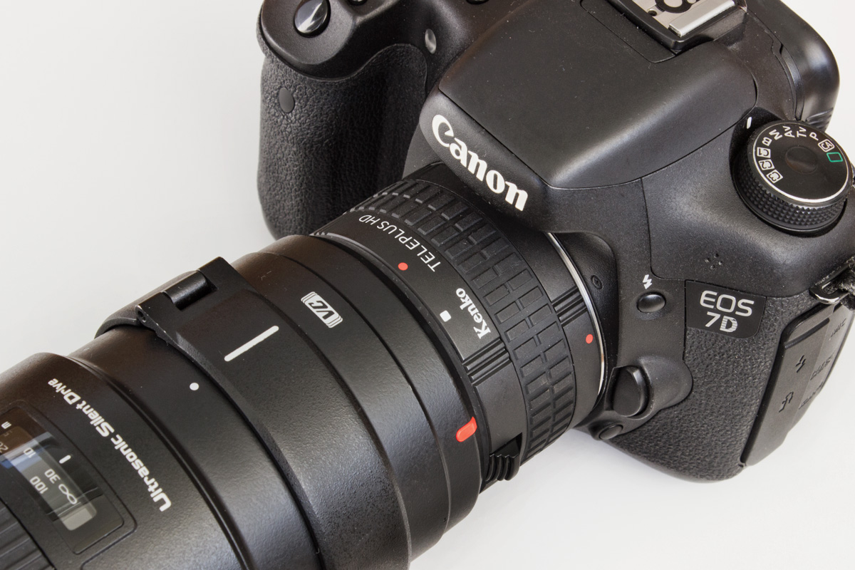 Der Konverter an der EOS 7D mir dem Tamron 1:2,8 / 70-200 mm, mit dem alle Funktionen übertragen werden.
