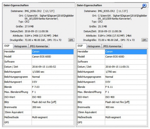 Durch den Mikrochip im Konverter werden die Blendenwerte und die Brennweite korrekt umgerechnet und in die Exif-Daten richtig eingetragen