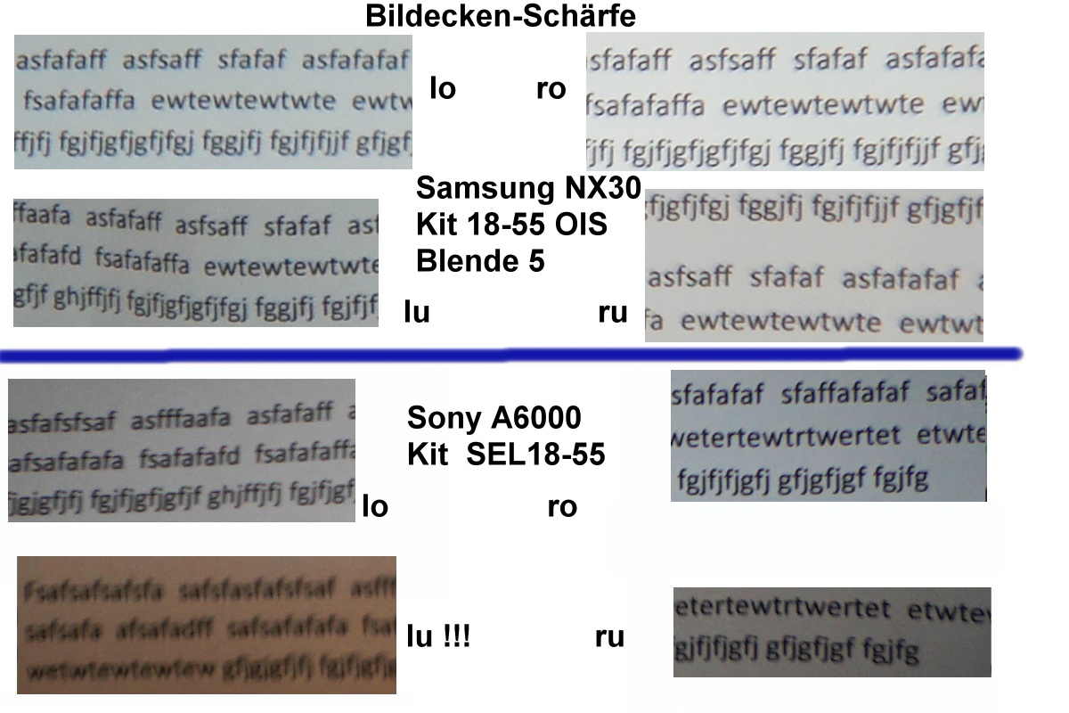 Man beachte auch das unsymmetrische Schärfebild des SEL-Objektivs. Den gleichen Test habe ich mit dem SELP1650 gemacht, dass sogar noch schlechter abschneidet. Beide Objektive haben Schärfe-Unsymmetrien. Dagegen ist die Schärfe-Symmetrie bei dem 1855OIS von Samsung recht gut.