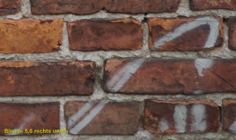 jetzt ein Vergleich der Randbildschärfe bei verschiedenen Blenden. Aufgenommen aus der Hand.