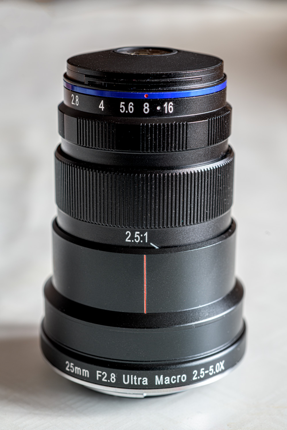Technische Daten: Brennweite: 25mm Maximale Blendenöffnung: f/2.8 Minimale Blendenöffnung: f/16 Blendenlamellen: 8 Blendeneinstellung: manuell Bildwinkel: 10,3 Grad für Sensorgröße:Vollformat minimaler Fokussierabstand: 17,3cm (5x) – 23,4cm (2,5x) Abbildungsmaßstab: 2,5:1 bis 5:1 Fokussierung: manuell Optischer Aufbau: 8 Elemente in 6 Gruppen