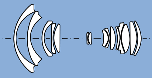 Optischer Aufbau: 15 Linsen in 11 Gruppen