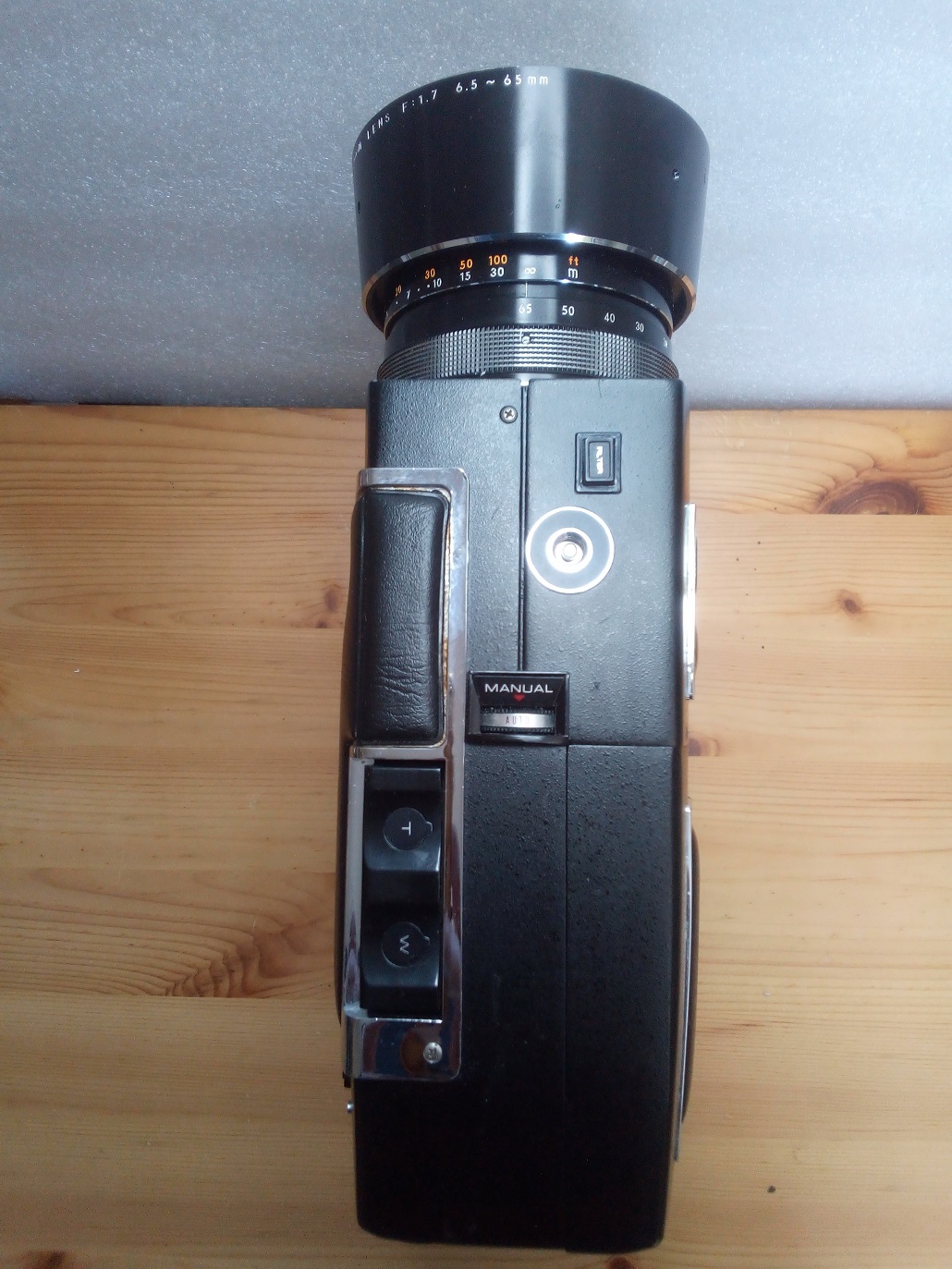 Was zuerst auffällt ist das hohe Gewicht von knapp 2 Kg. Langes, ermüdungsfreies Filmen ist damit sicherlich nicht möglich (Meine PORST SOUND aus den späten 70er Jahren, übrigens eine umgelabelte Chinon, hatte ein ähnliches Gewicht und nach einem durchfilmten Rennwochenende tat einem schon der Arm etwas weh). Geschuldet ist die wohl der Mechanik und dem großen, mit 1,7 sehr lichtstarken, Objektiv. Erwähnenswert ist auch der große Zoom Bereich von 6,5 - 65 mm Brennweite. Zoomen kann man entweder manuell oder mittels zweier Taster auf der Kameraoberseite elektrisch. Fokussiert wird allerdings nur manuell.