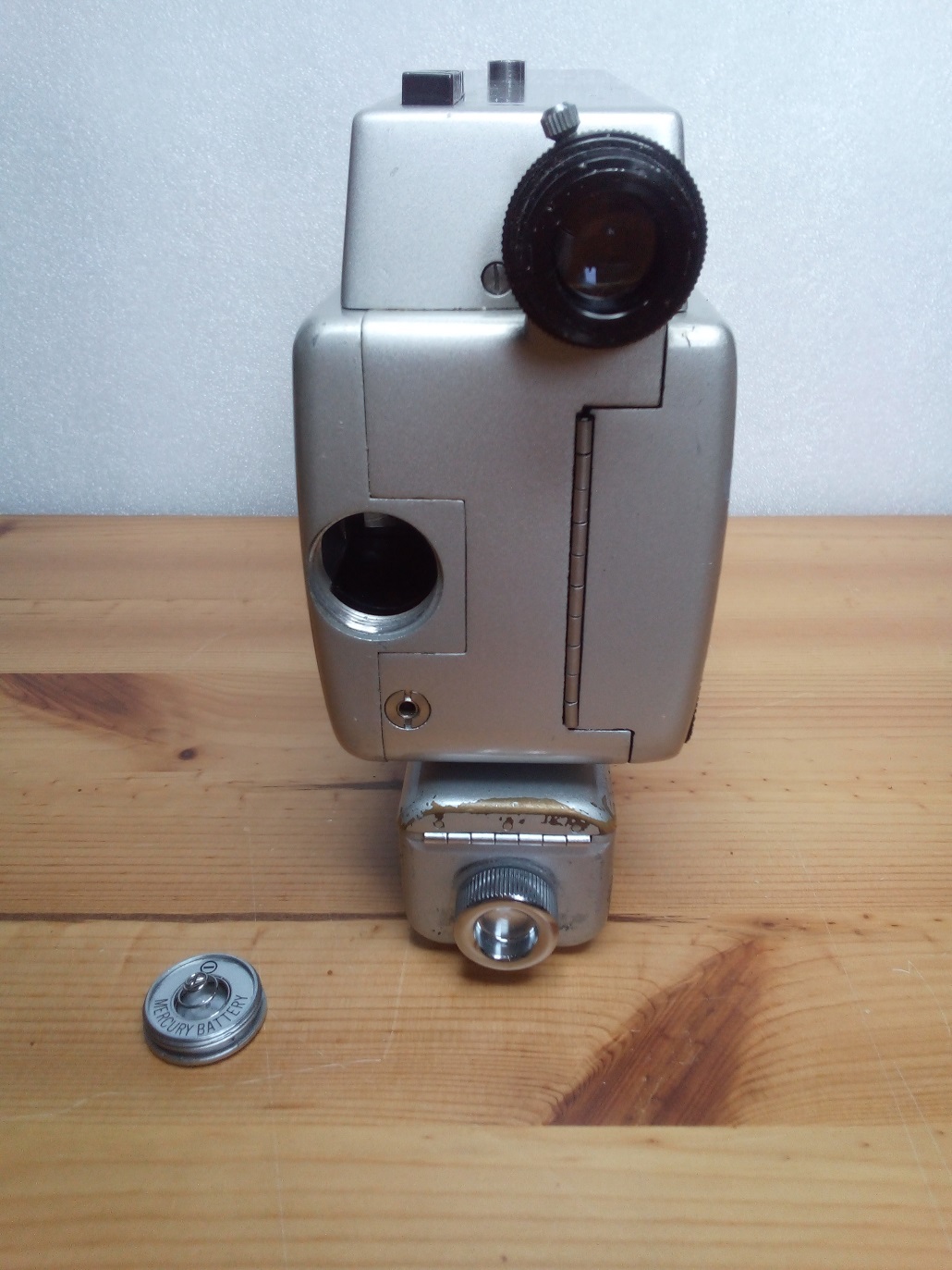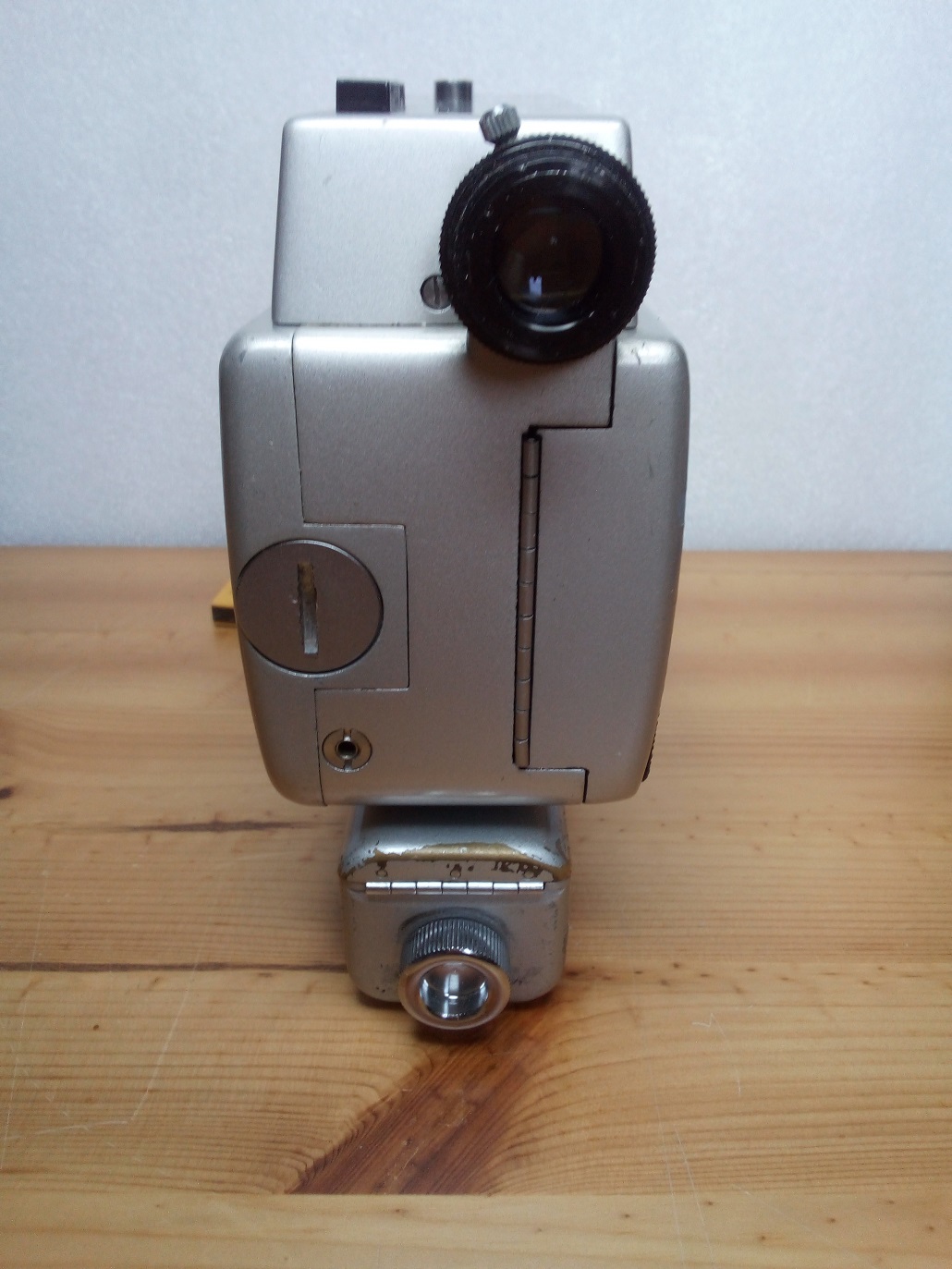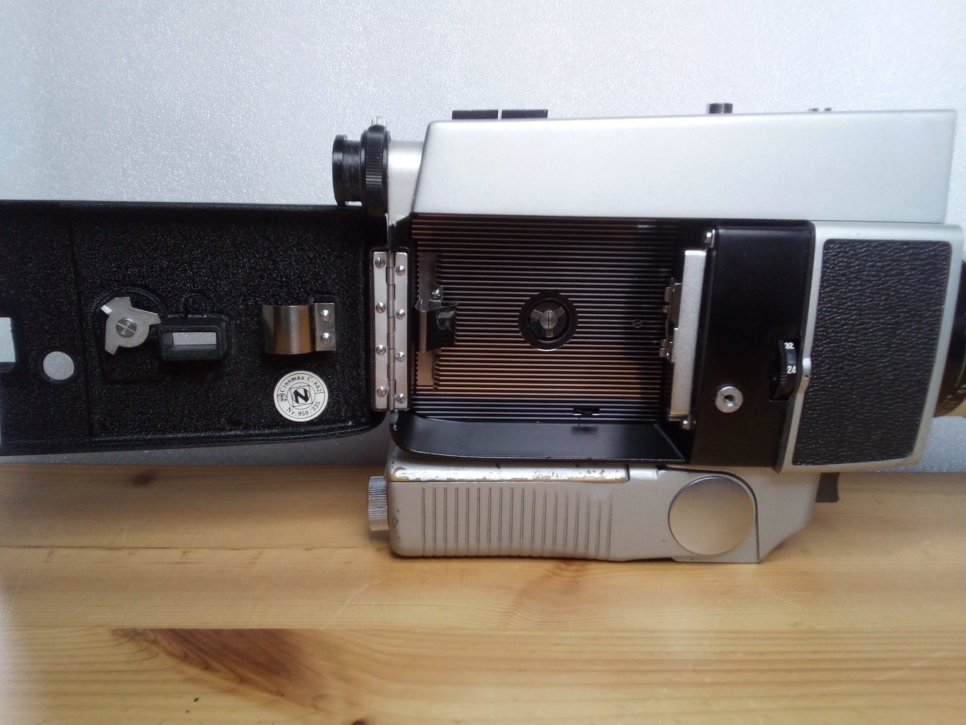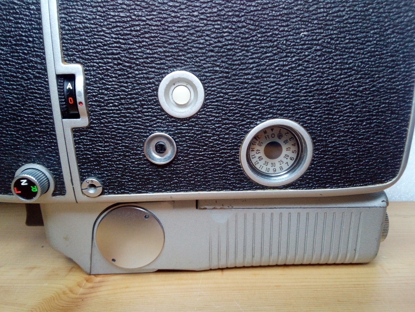 Die Filmkassetten können in drei Geschwindigkeitsstufen belichtet werden (18, 24 und 32 Bilder / sec). Mit einem Drehrad kann der Auslöser gesperrt werden ("L"). Weiterhin befinden sich auf dieser Seite der Kamera das Filmzählwerk und andere Tasten und ein Anschluß deren Funktion ich mangels einer Anleitung nicht deuten kann.