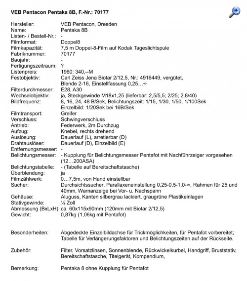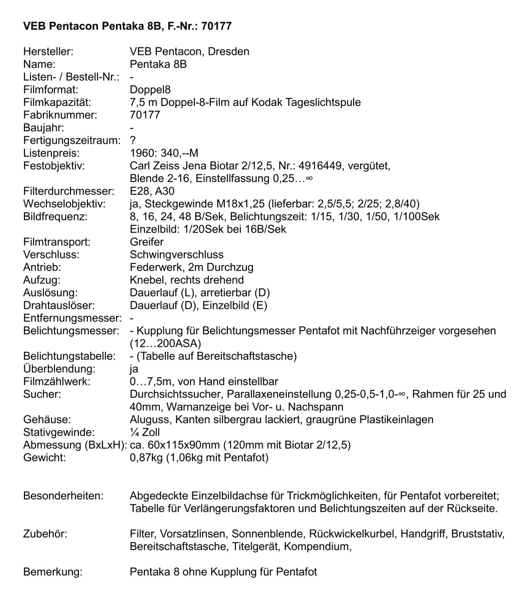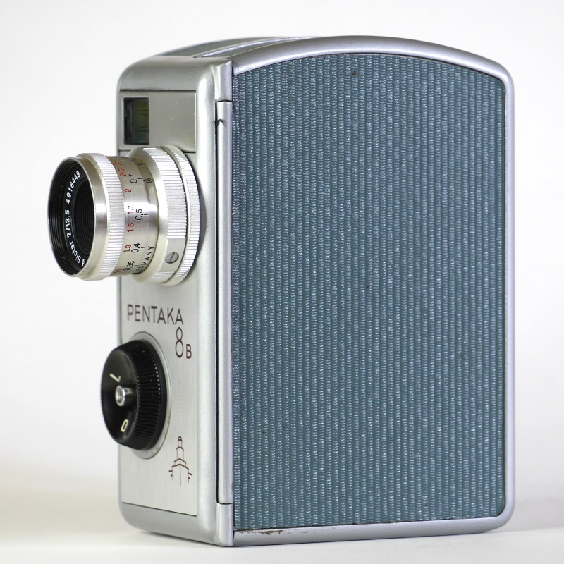 Die Pentaka 8 war eine Weiterentwicklung der Filmkamera AK8. Das Laufwerk hatte jetzt eine Bildfrequenzeinstellung, 8-16-24-48B/Sek, einen neuen Sucher mit Parallaxenausgleich, 0,25-0,5-1,0-∞ und einen Anschluss für Wechselobjektive. Die übrigen Eigenschaften entsprachen der AK8. Auf der Rückseite eine Tabelle mit Belichtungszeiten und Verlängerungsfaktoren für Filter.