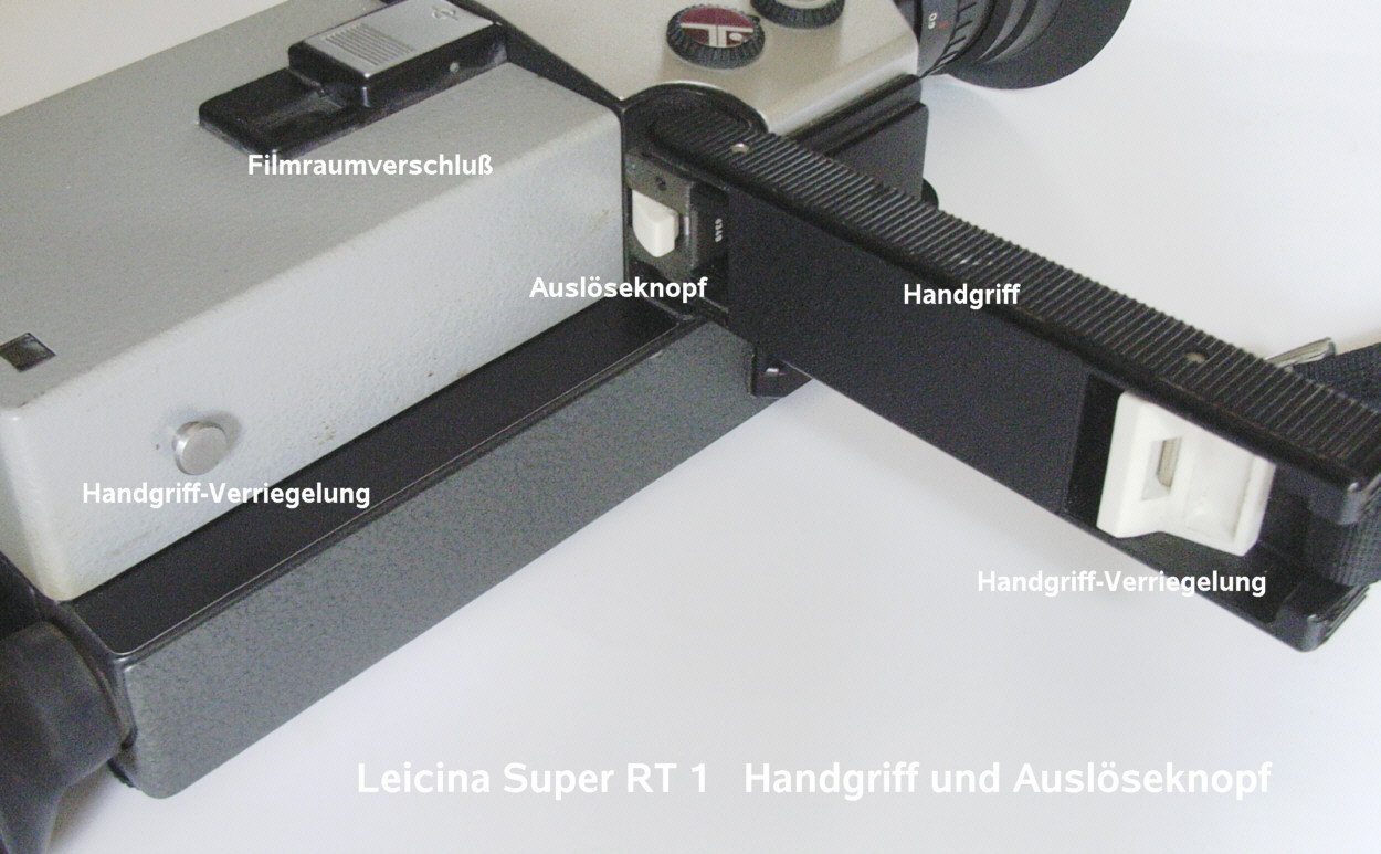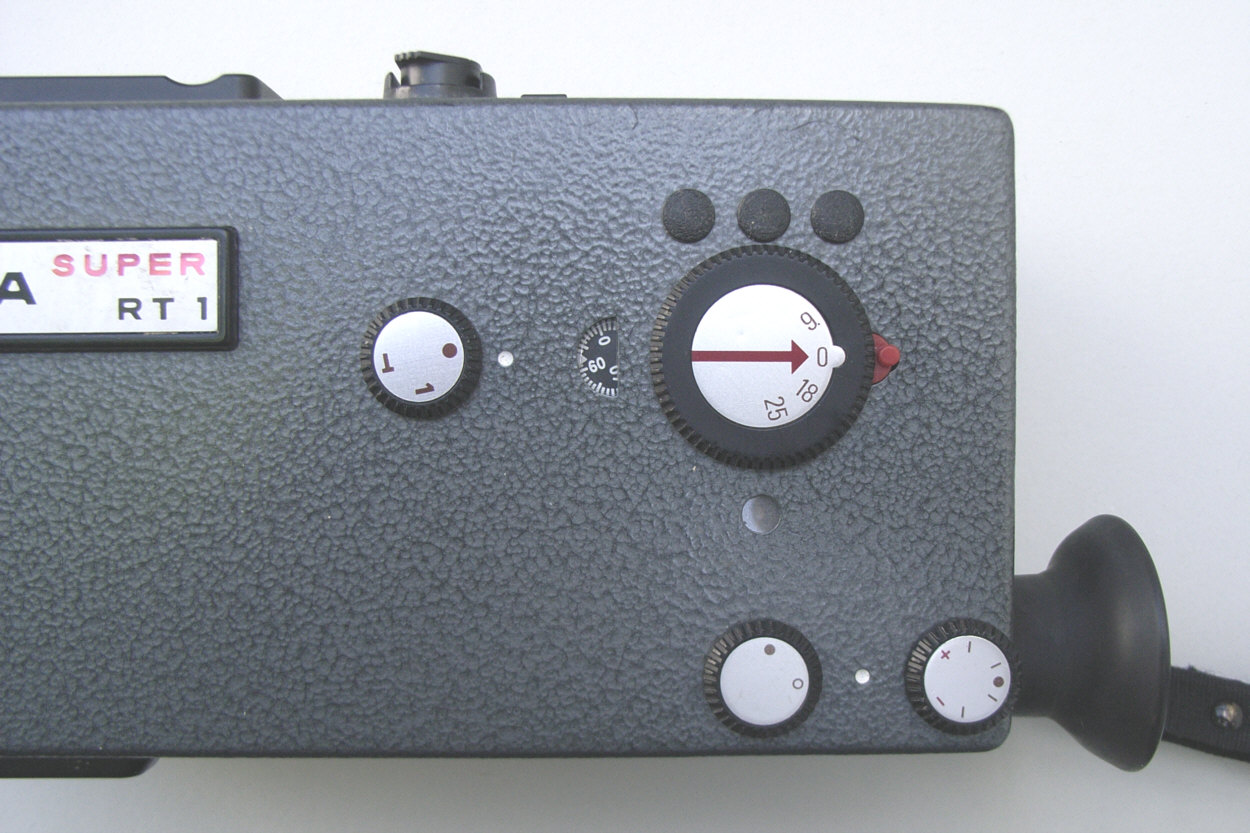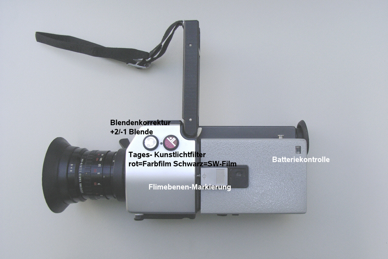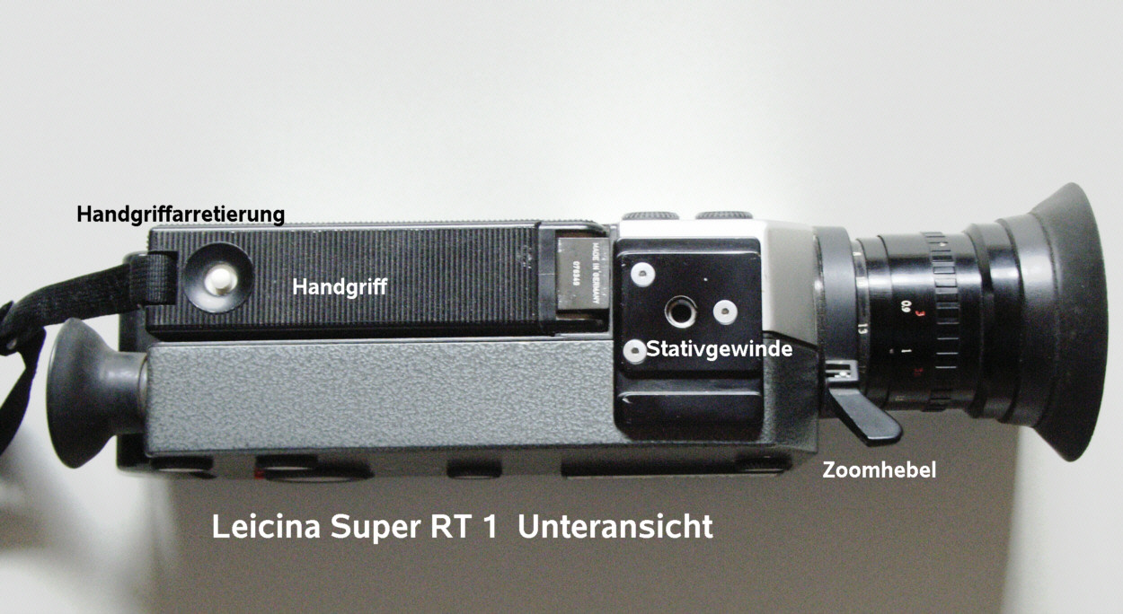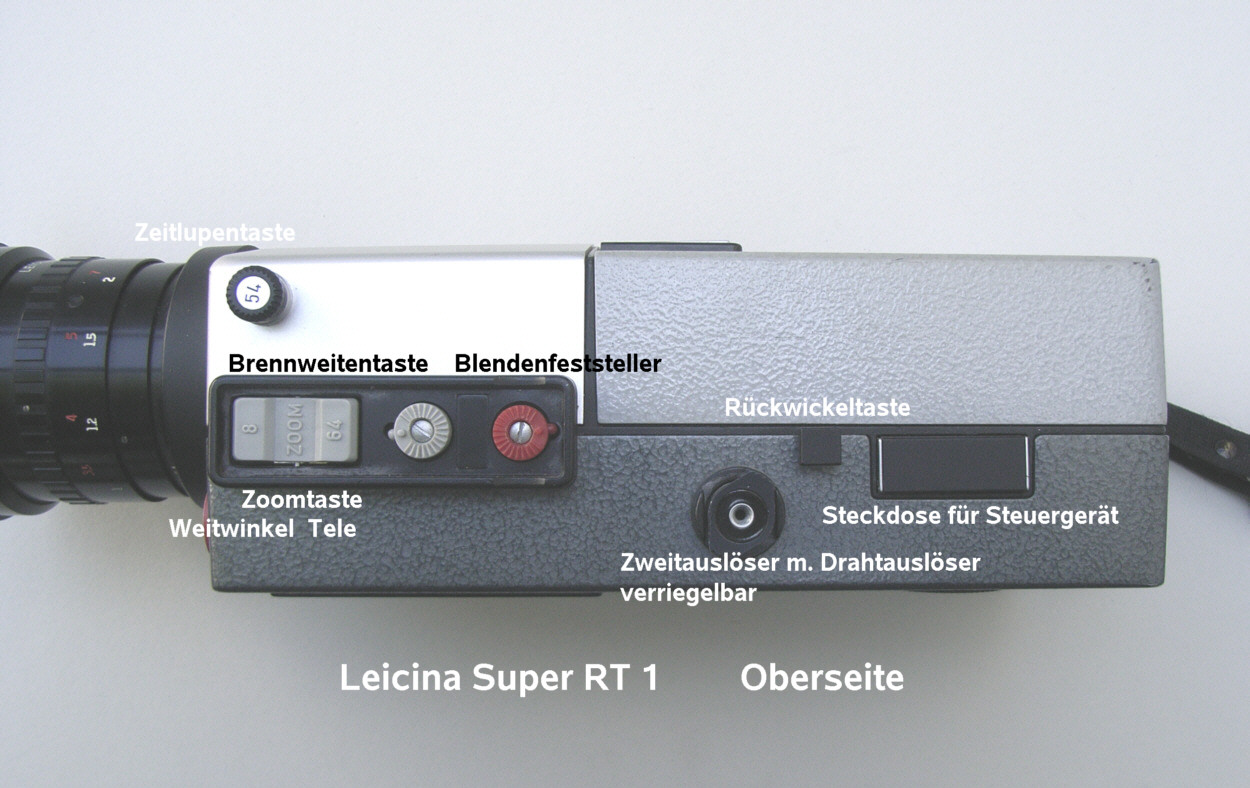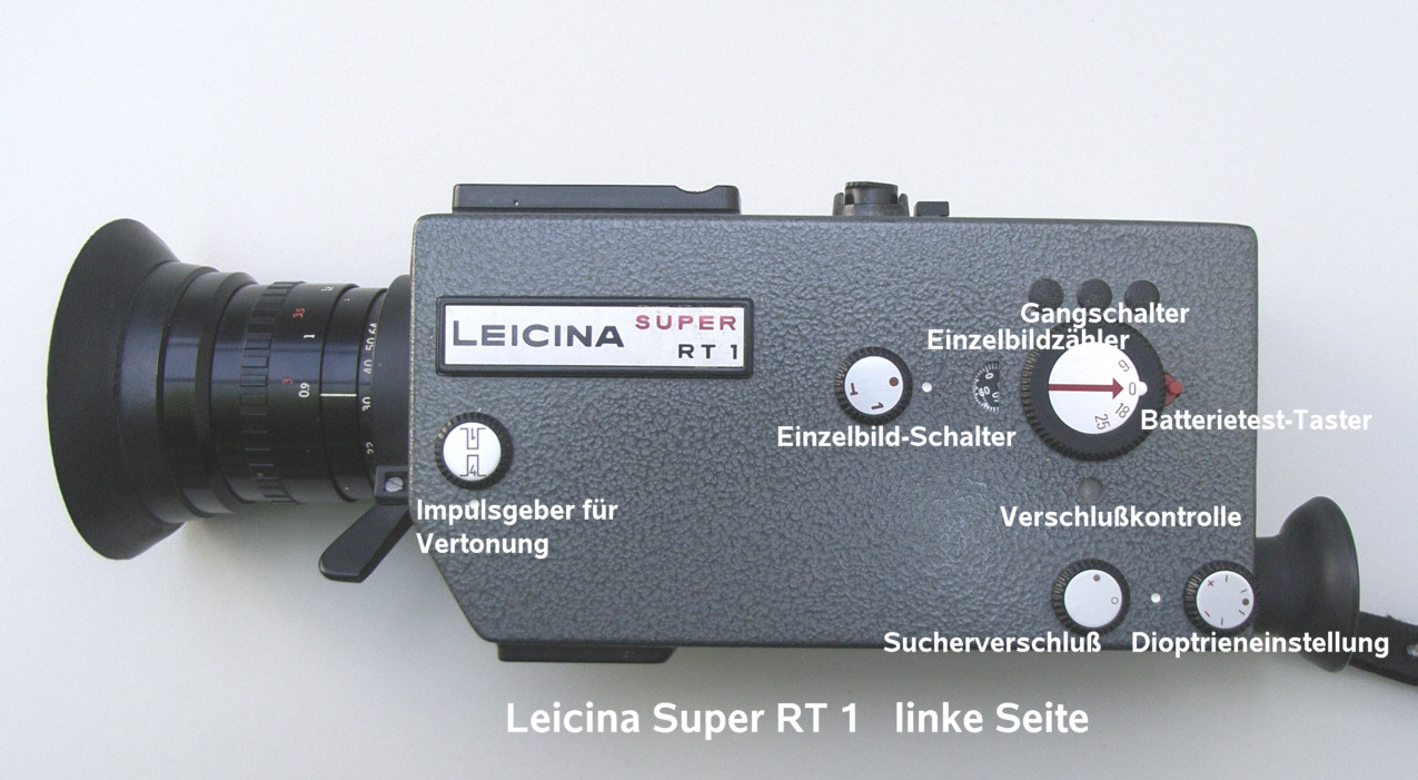Name: Leicina Super RT 1 Baujahr: nicht bekannt (1970-72?) Ser. Nr.: 076349 Format: Super 8 Objektiv(e): Leicina-Vario 1:1,9 8-64mm, 14 Linsen, Einstellung: 0,9m – unendlich Zoom: ja, Brennweitenverstellung: Motor (normal,schnell) oder Handhebel am Objektiv Wechselobjektive: nein Geschwindigkeiten (Bilder / Sek): 9,18,25,54, Einzelbild, Einzelbild-Langzeit (T) Leuchtdiode zur Verschlußkontrolle (rot=offen) Blenden: 2 - 16 Aufzug: Elektromotor Batterien: Mignon (R6, AA) 5 Stück Batteriekontrolle: ja Rechentabelle für Belichtung: nein, Belichtungsautomatik Belichtungsmesser: Lichtmessung durch das Objektiv Belichtungskorrektur : +2 / -1 Blenden Blendeneinstellung: automatisch durch Motor, Blendenfeststeller vorhanden Sucher: Durchsichtsucher mit Strahlenteiler im Objektiv, dadurch Parallaxenausgleich nicht nötig Sucher: Blendenanzeige, Filmreserveanzeige, Auf- Überblendanzeige, Brennweiteninfo im Sucher (Warnung bei Tele über 22 mm) Sucher Dioptrienausgleich: ja +/-2 dpt Entfernungmesser: Schnittbildentfernungsmesser im Sucher Tageslicht/Kunstlichtfilter: ja, für Farb- und SW-Film Filmzählwerk: ja, Einzelbildzäher: bis 80 Bilder, Filmreserveanzeige im Sucher Drahtauslöser: ja Film-Empfindlichkeiten: 15-27 DIN (25-400 ASA) Filmkontrollfenster: ja Besonderheiten und Sonstiges: Aus-, Auf- und Überblendmöglichkeit, Vertonungsimpulse, Stativgewinde, Schulterstativ, elektronisches Steuergerät für Zeitrafferaufnahmen, Fernauslösung, lippensynchrone Vertonung, Blitzauslösung, Netzversorgung