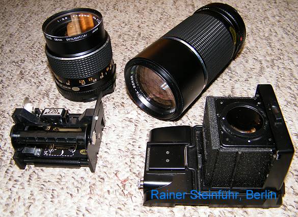 Objektiv(e): Mamiya-Bajonett. Springblenden.In meinem Fall: ---Normalbrennweite Sekor-C, 1:2,8 - 22 , f=80 mm. 6 Linsen, 0,7 Meter - unendlich. Filtergewinde 58 mm. Blendenwert-Weitergabe. Gute Bildschärfe.