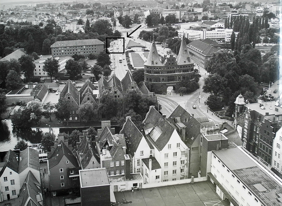 Hallo zusammen, hier ein kleines Beispiel für die Abbildungsleistung des Weitwinkelobjektivs (Secor-C, 1:2,8 - 22, f=55 mm. 9 Linsen, 0,55 Meter - unendlich). Ich habe ein Photo im Format 40 x 30 cm abphotographiert und dann auf ein hier im Forum brauchbares Format mit nur 900 Pixel Breite gebracht und dann einen Bildausschnitt (um die Strassenuhr) per Makro aufgenommen. Dadurch kommen natürlich Verluste hinzu. Das Negativ ist noch aussagekräftiger.