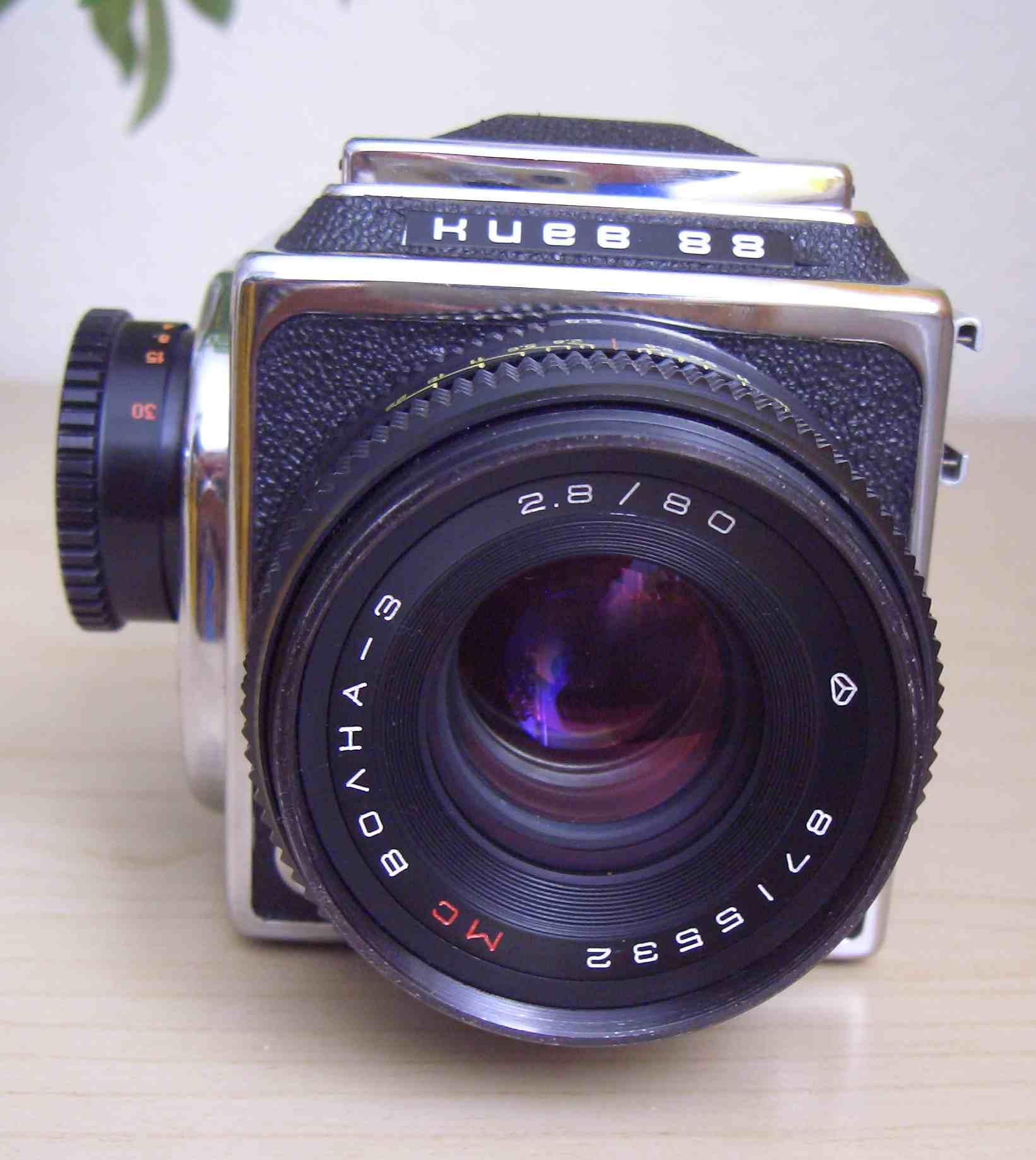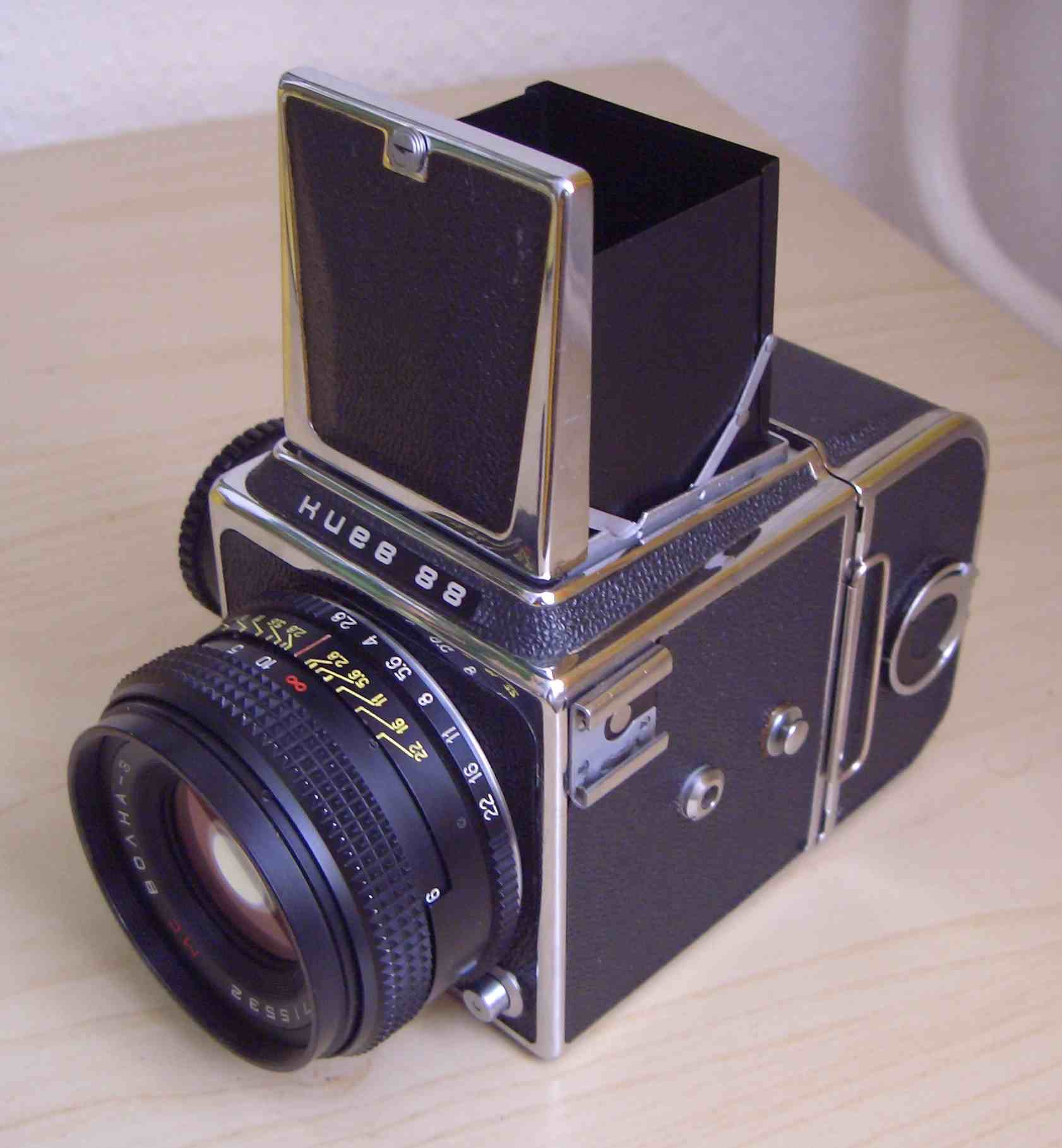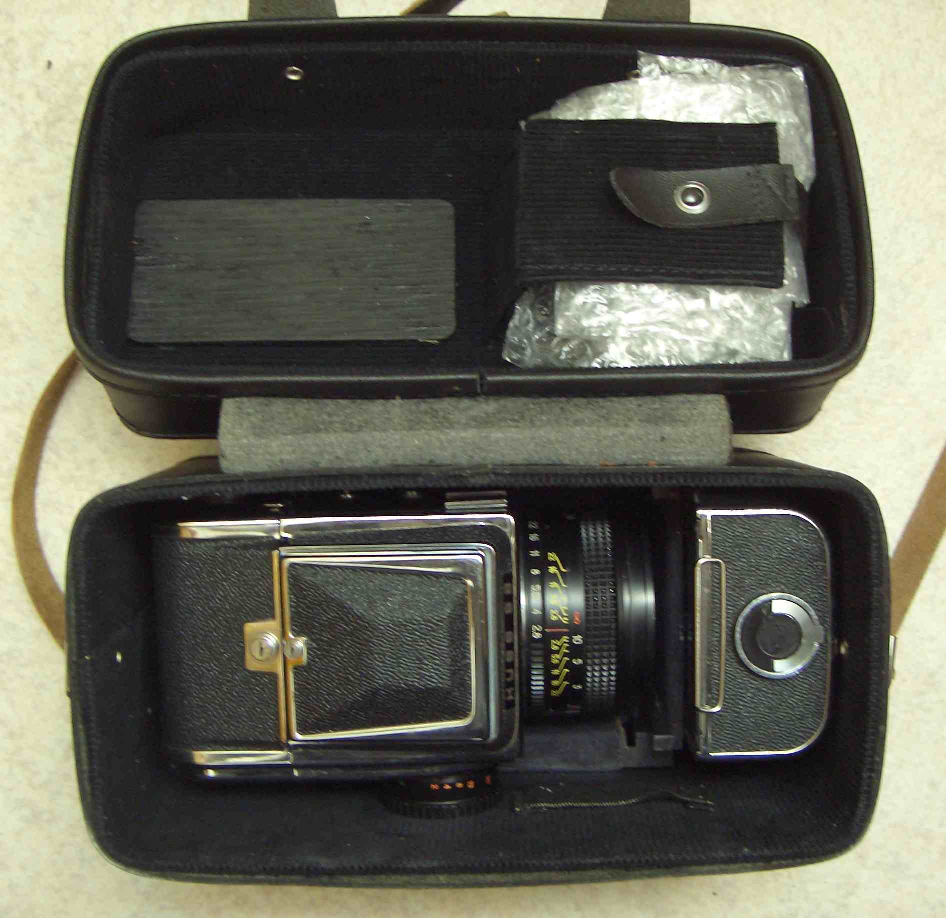 Hier ist meine neueste Kamera ,eine Kiev-88 ,die ich über ein Inserat mehr als günstig bekommen habe und als defekt angeboten wurde. Der optische zustand ist erste Sahne in echt sieht die aus wie neu.Nur eben hat diese das Problem mit dem auslösen naja. Das Objektiv läuft sauber und weich ohne Probleme und ist auch ohne Kratzer oder Mackel. Dazu gab es die Transporttasche,ein 2tes Filmmagazon und noch Filter. Also diese Kamera wird sicher lange bei mir bleiben.