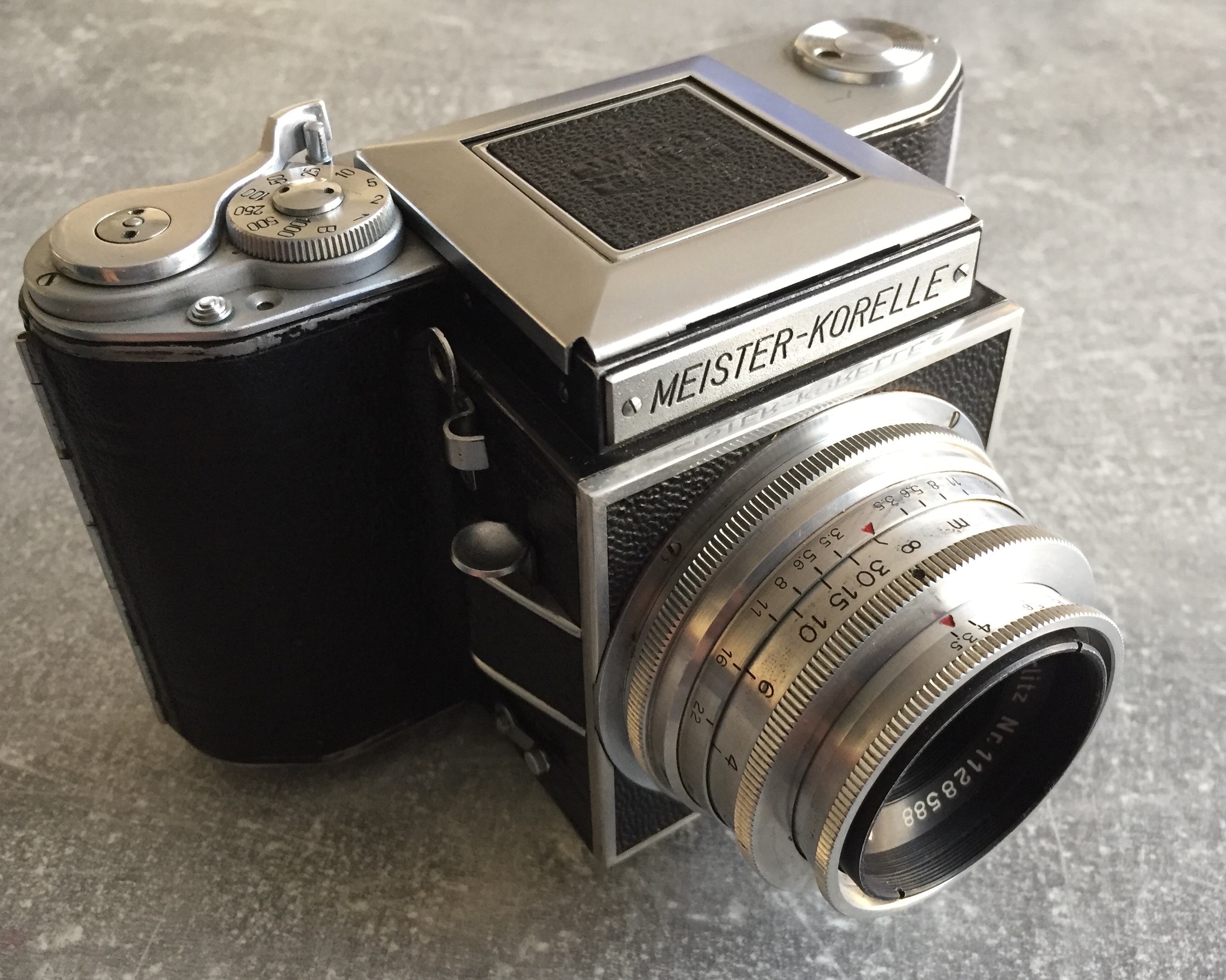 Hersteller: VEB Wefo Dresden Modell: Meister-Korelle Baujahr: 1950 - 1951 Format: Rollfilm 120, 6 x 6cm Objektiv: Wechseloptik, Gewinde M60 (hier: Meyer Görlitz Primotar 3,5/85 V) Verschluss: Gummituchschlitzverschluss Verschlusszeiten: B, 1 s bis 1/1000 s Blitz: Anschluss in 3/8‘-Stativgewinde Belichtungsmesser: nein Filmzählwerk: ja Filmtransport: Schnellschalthebel Selbstauslöser: ja Filmtyp-Merkscheibe: nein Filmtransport: von Hand Sonstiges: Stativgewinde, Doppelbelichtungssperre, Sportsucher mit Parallaxenausgleich, Gewicht Gehäuse: 701g