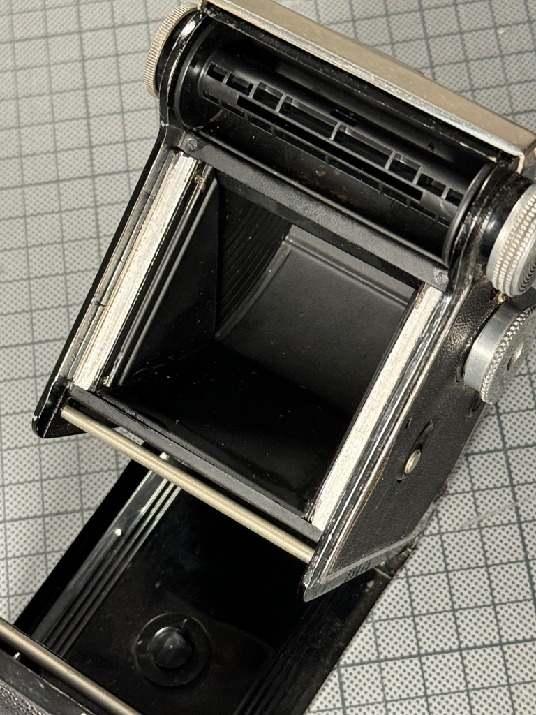 damals so gewollt bzw. für die Amateurfotografen kein Problem? Brachte man die Kamera zum Einlegen und Entnehmen des Films vielleicht sowieso zum Fotografen, der die Rückwand dann abschraubte? Nach einer Eigenbastelei sieht das nicht aus, dafür sitzt die Metallspange zu perfekt und sieht auch professionell aus. An den Schräubchen sind kleine (heute ausgeleierte) Federn. Möglicherweise war das mal so gedacht, dass man bei nicht ganz eingedrehten Schrauben die Spange (ohne Drehen der Schrauben) leicht hochdrücken und so die Rückwand lösen konnte. Das funktioniert jetzt aber nicht mehr, der Riegel sitzt richtig fest. Also Öffnen nur mit Schraubenzieher... Merkwürdig! Kennt jemand von euch ähnliche Rückwandverriegelungen bei alten Kameras? Diese Modelle sind ja gut 80 Jahre alt.