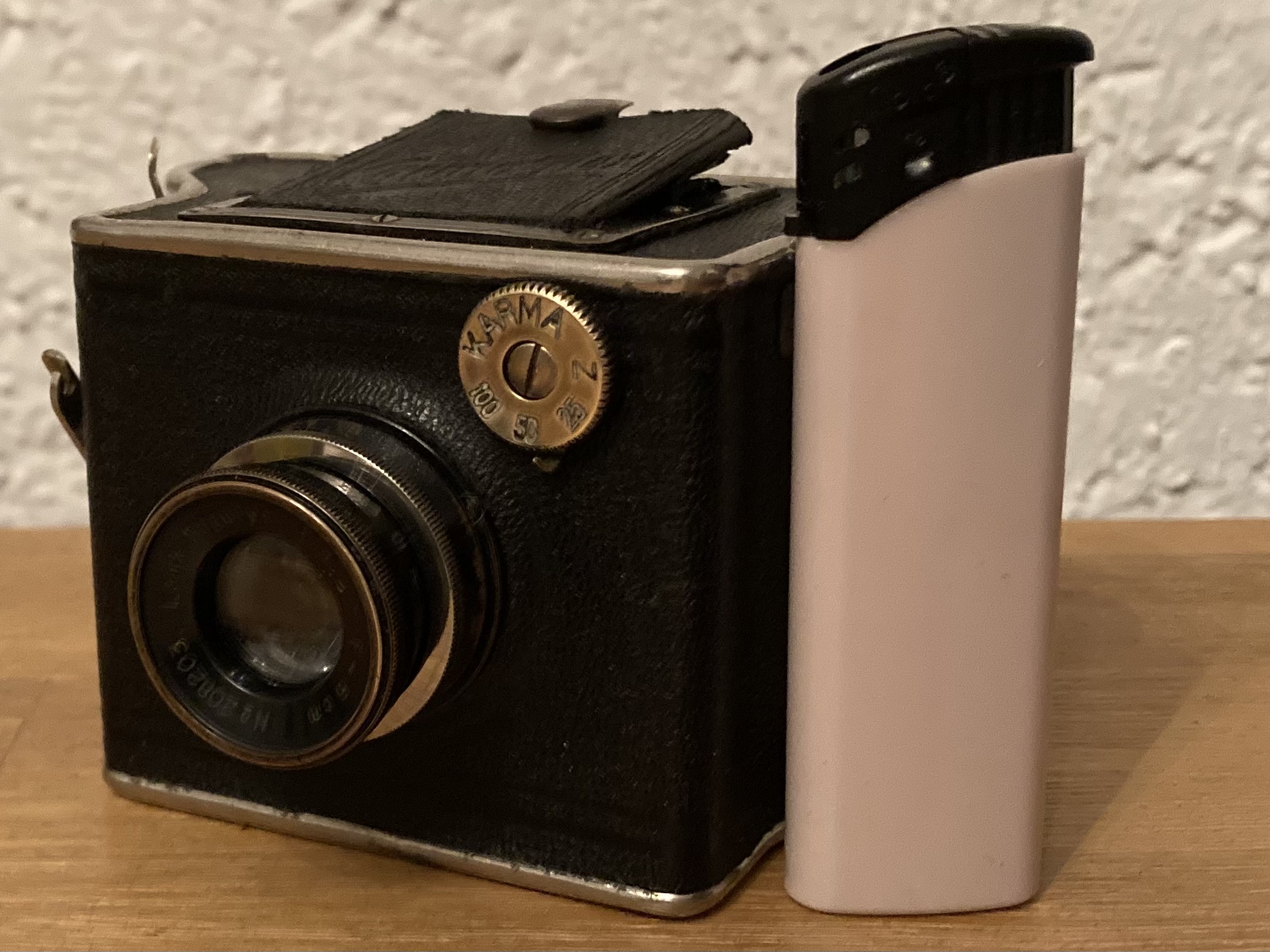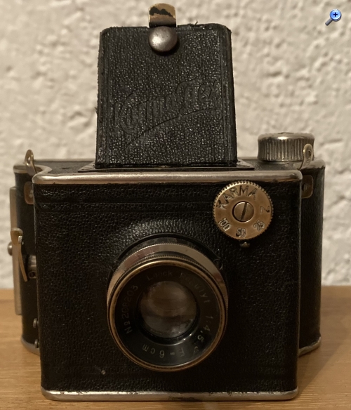 Bei dieser Karma-Flex (1) handelt es sich um eine einäugige SLR aus den frühen 1930er Jahren für 127er Rollfilm mit dem Aufnahmeformat 4x4.