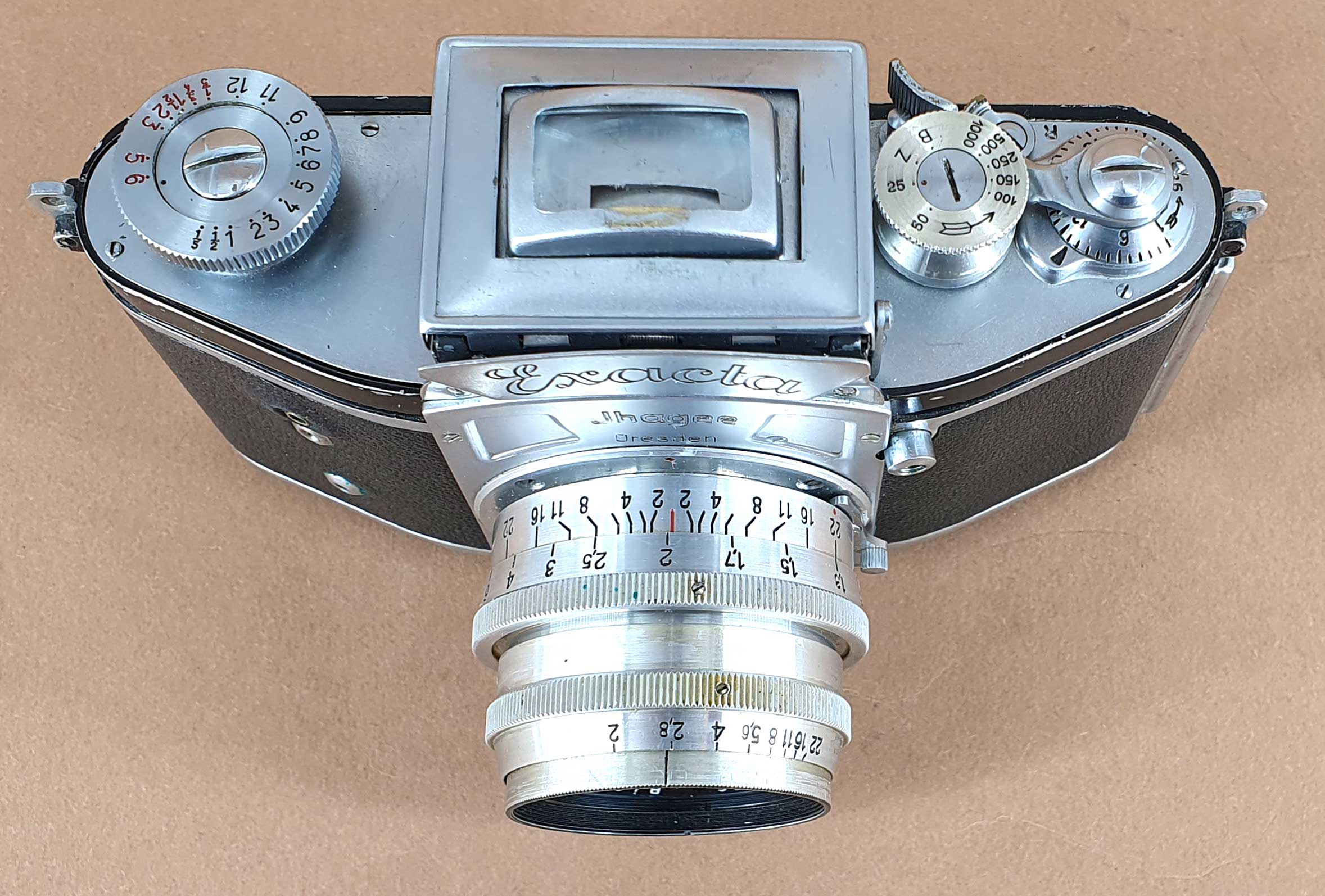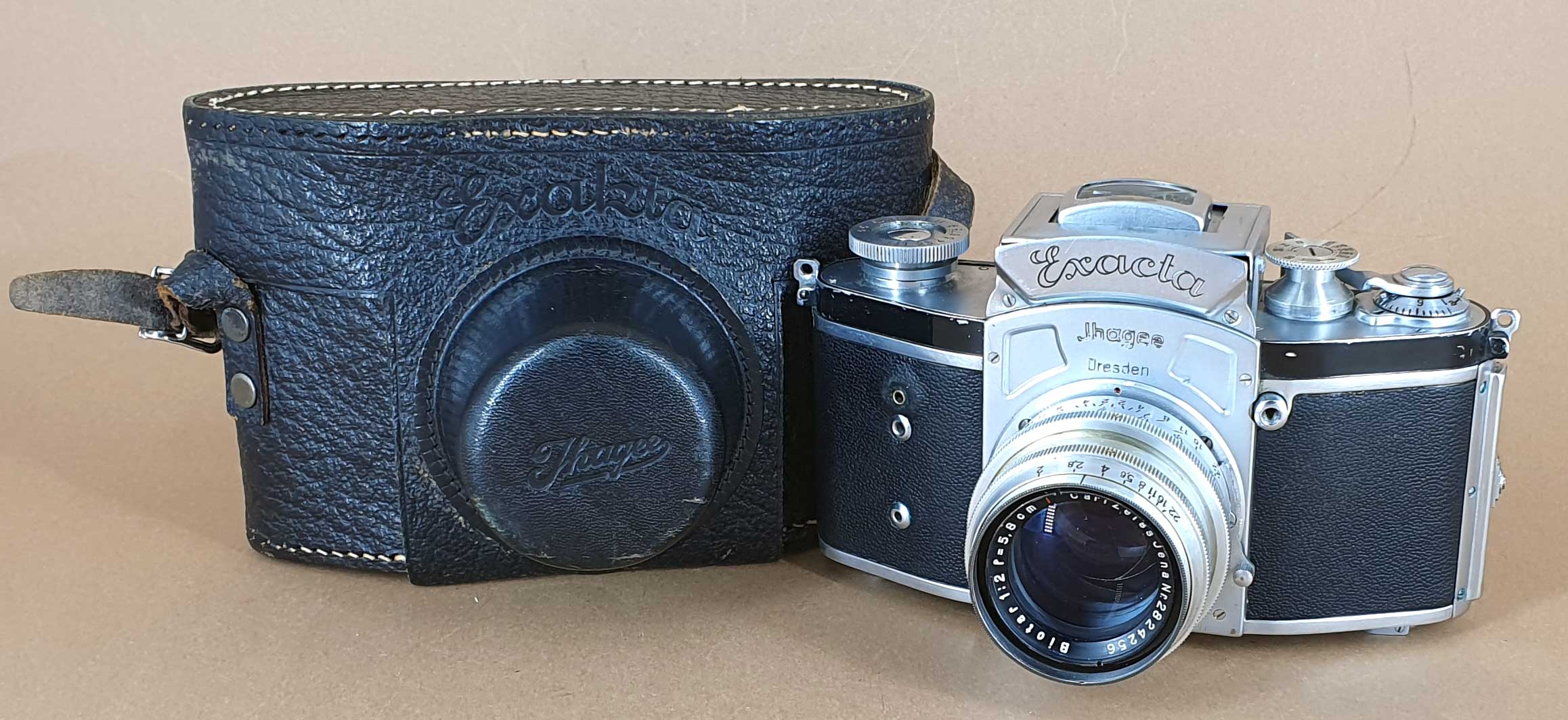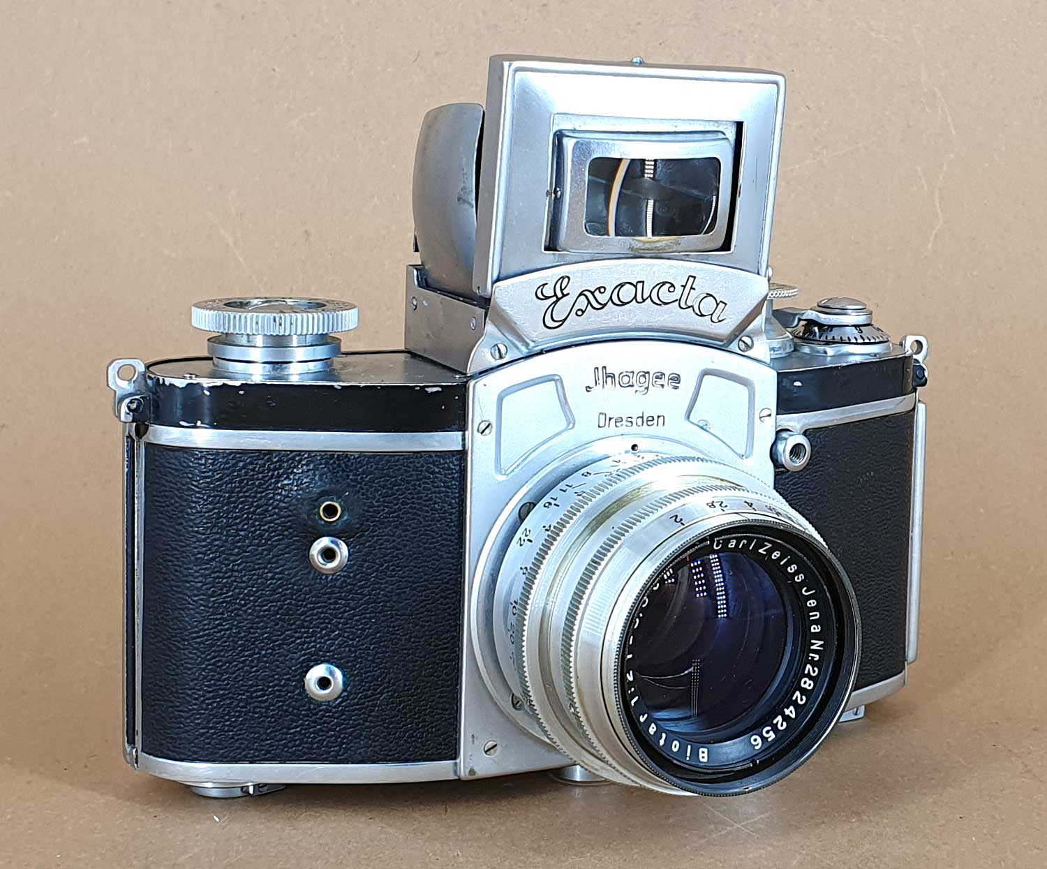 Hersteller: Ihagee Modell: Kine Exakta („Exacta“, C-Exakta oder Reparation*(S)*akta) Art: SLR Format: Kleinbildfilm 135, 24 x 36 mm Objektiv: Carl Zeiss Jena Biotar 1:2 f=5,8 cm vergütet Blenden: 2 - 22 Verschluss: Vertikaler Stoffschlitzverschluss Verschlusszeiten: B, Z, 12 s bis 1/1000 s Blitz: Blitzanschluss an Kameravorderseite Filmtransport: Schnellschalthebel Sonstiges: Bildzählwerk, Stativgewinde, Lichtschachtsucher mit Sportsucher und Lupe
