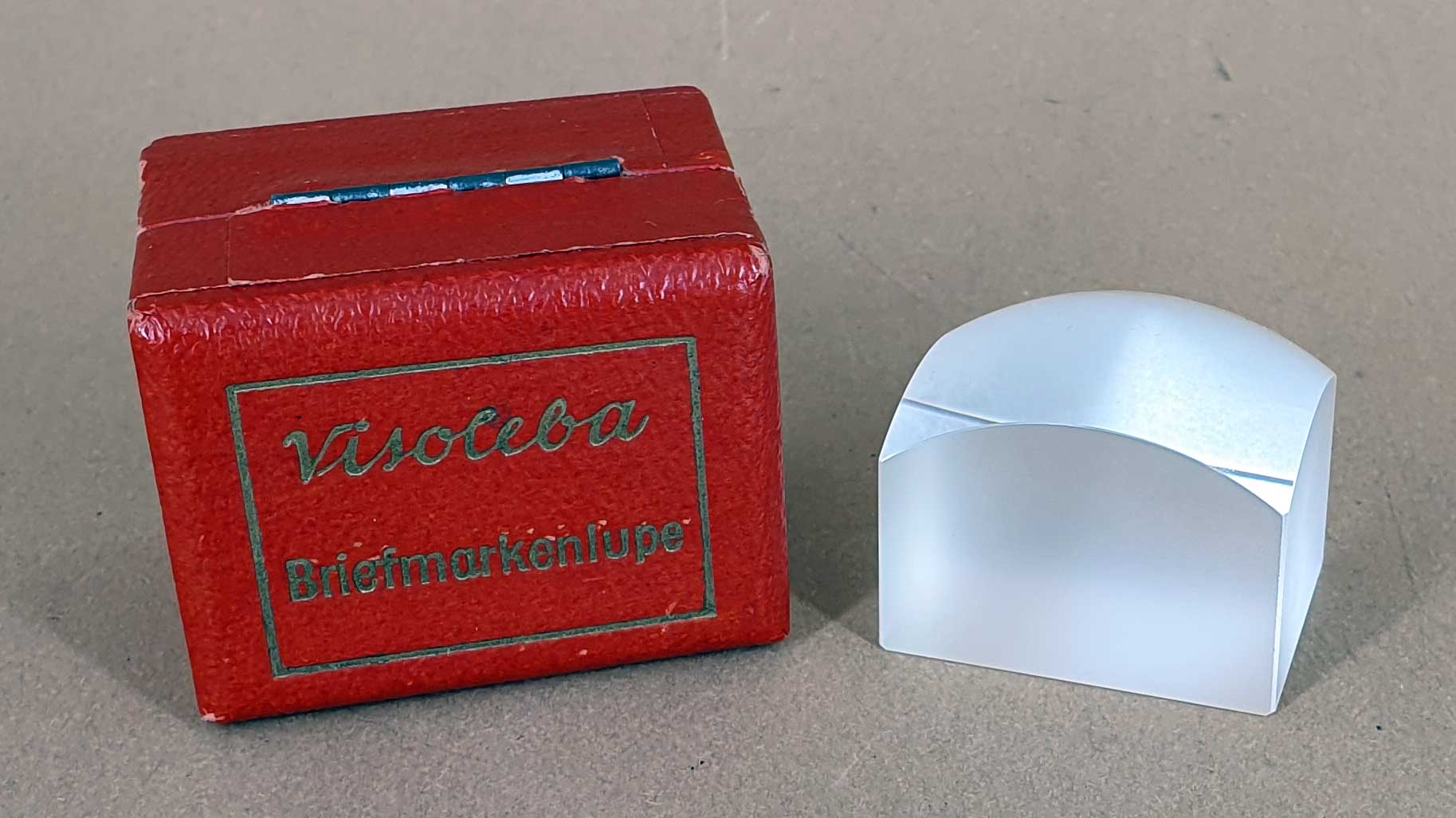 Beim Sucher der Kine Exakta gab es bei mir noch ein kleines „Aha-Erlebnis“. Die Suchermattscheibe ist nicht als flache Platte ausgeführt, sondern weist auf der Oberseite eine linsenförmige Krümmung auf. Es ist ein recht dicker Glasklotz, der dort verbaut wurde und ein sehr helles und großes Sucherbild liefert (auch nachzulesen auf der Website von Horst Neuhaus). Nun steht auf meinem Schreibtisch seit vielen Jahren ein kleines rotes Kistchen mit der Aufschrift „Visoleba Briefmarkenlupe“, welches ich einst von meinem Vater geerbt habe.