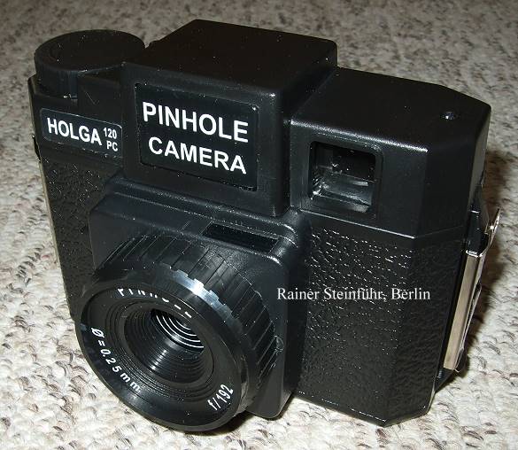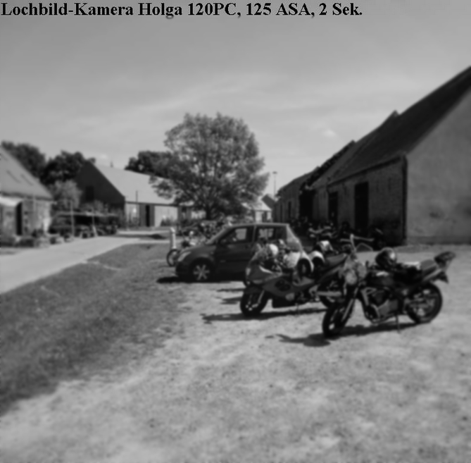 Nachtrag: Das Loch bei der Holga ist aus meiner Sicht zu groß. Ich habe deshalb mit Alu-Folie-Methode ein halb so großes Loch vorgesetzt. Auf dem Kamera-Foto weiter oben noch nicht angebracht. Das Original-Loch brächte deutlich weichere Bilder.