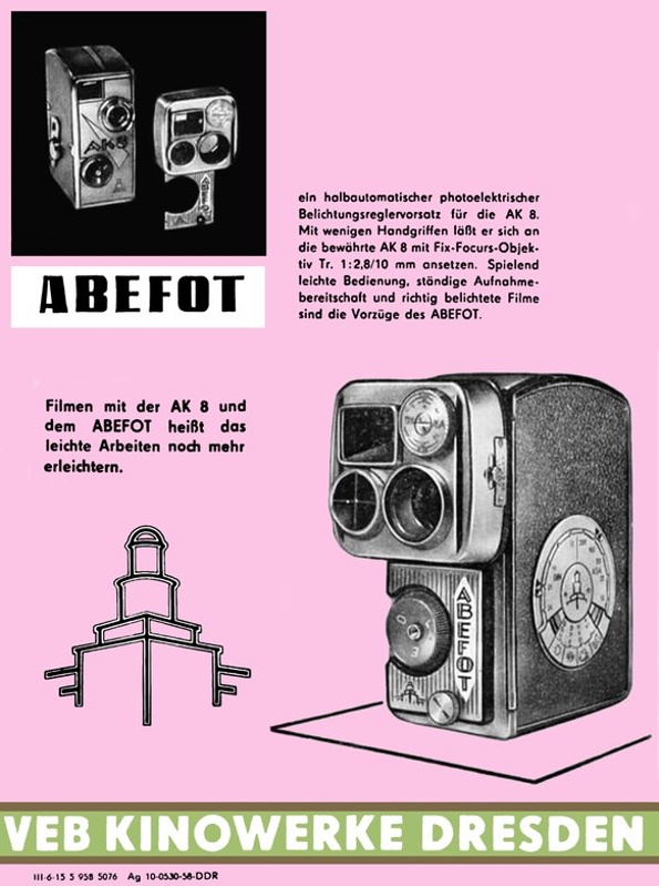 Eine Belichtungshilfe war die ´Belichtungswertuhr´, eine Rechenscheibe, die sich auf der Bereitschaftstasche oder dem Kameradeckel befand. Im Laufe der Weiterentwicklung wurde der Belichtungsmesservorsatz Abefot mit Blendennachführung angeboten, der an der Frontseite befestigt werden konnte. Ältere AK8-Modelle konnten mit der Gewindebuchse für die Montage auf der Frontplatte nachgerüstet werden. Eine sehr robuste Ausführung wie es auf dem Prospekt zu sehen ist.