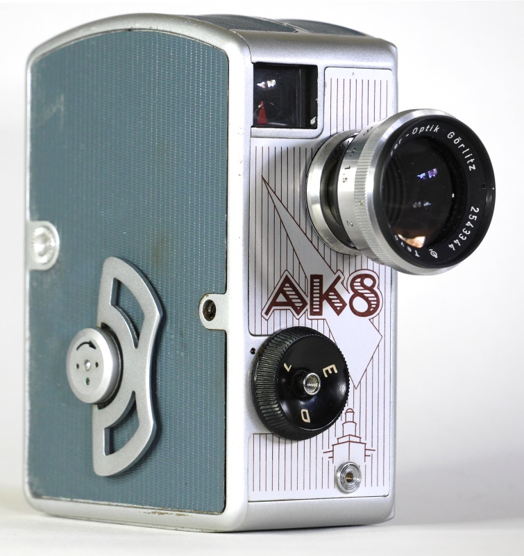 Hier ist die Hauptdarstellerin des vorgestellten DEFA Werbefilms, die AK8 des VEB Zeiss-Ikon (Dresden). Sie war die erste nach 1945 im Osten Deutschlands gefertigte 8mm-Kamera, bis dahin waren nur Kameras aus dem Ostblock im Handel. Die AK8 wurde in großen Stückzahlen von 1950 bis ca. 1965 produziert. Meiner Meinung nach der Trabant unter den Filmkameras, war sie doch der Wunschtraum vieler Filmamateure. Der stolze Preis bei Einführung: 288,--M, ab 1960 215,--M.