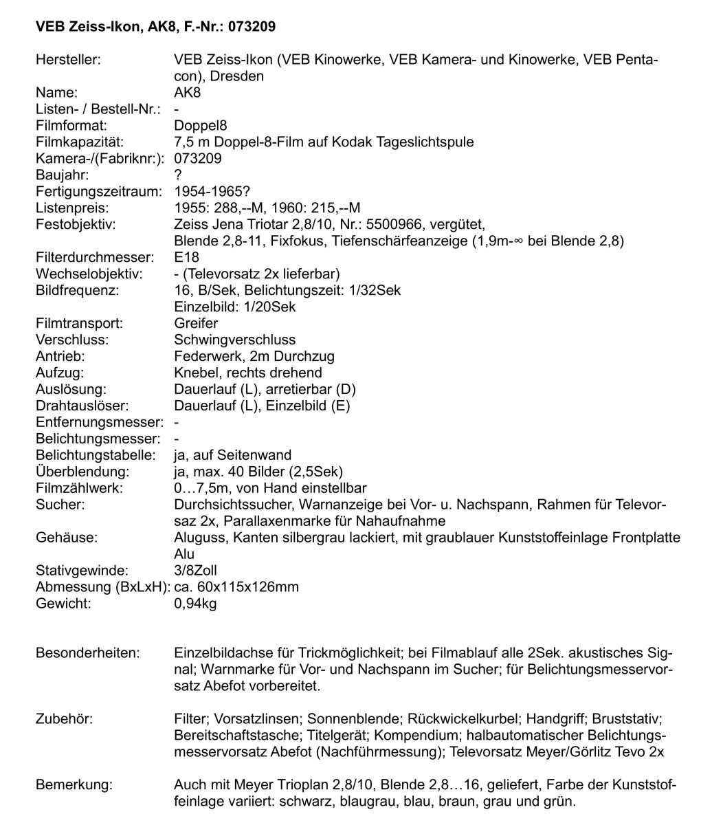 auf der Seite https://zeissikonveb.de/start/kameras/ak8-und-pentaka.html sind auch noch interessante Informationen zu finden. In der Mitte des Artikels wird ein Probefilm, aufgenommen im Jahre 2020, gezeigt. Wären nicht die modernen Fahrzeuge zu sehen könnte man tatsächlich glauben, dass die Aufnahmen aus den 1950er Jahren stammen.