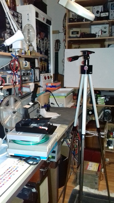 Hier habe ich meine Bastelbude zu einem "Super 8 Kopier Studio" umgebaut. Mit der Lumix die Filme aufgenommen und auf DVD gebrannt. Qualität ist gut. Immerhin sind die Streifen aus 1970 und immer noch im guten Zustand. Die Klebepresse ging noch ganz gut. Immerhin wurden 7,3 Gibabit DVD daraus.
