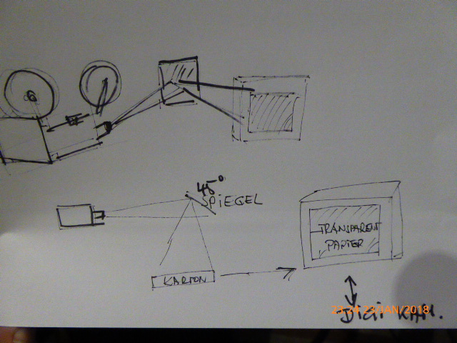 Es gibt noch die Möglichkeit, dass man einenen Spiegel zum zum Projektor 45 Grad die Bilder umlenkt. Mit einem Karton mit Transparentpapier als Leinwand aufbaut. Dahinter kann dann mit der Digital Kamera aufgenommen werden.