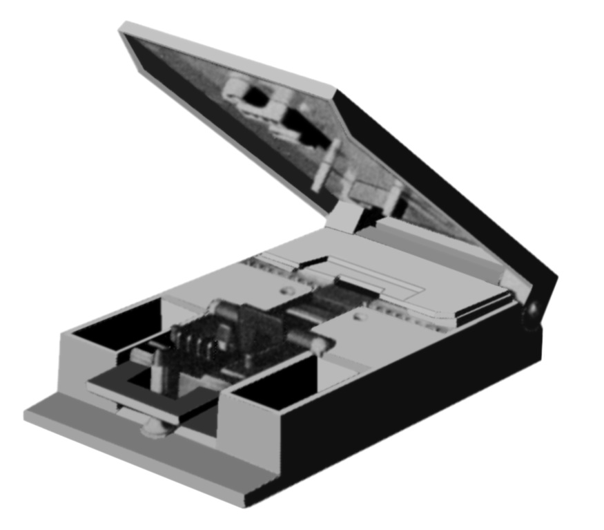 hier eine Skizze der Trockenklebepresse Hama Cinepress Automat 8. Nach Einlegen des Films und Trennschnitt (im Deckel eingebaut, Deckel nach unten drücken) mit dem Gerät (beide Teile passen dabei exakt aneinander) wird mit einer Bewegung der Klebeeinheit der durchsichtige Klebestreifen mit den Rasterlöchern an der richtigen Stelle umschlungen und verklebt, dabei wird auch eine eventuelle Tonspur freigelassen. Jeweils 2 Bilder beider Filmstreifenteile werden zusammengeklebt. Man konnte in die Klebepresse einige Klebestreifen in zwei Fächern auf Vorrat aufbewahren.