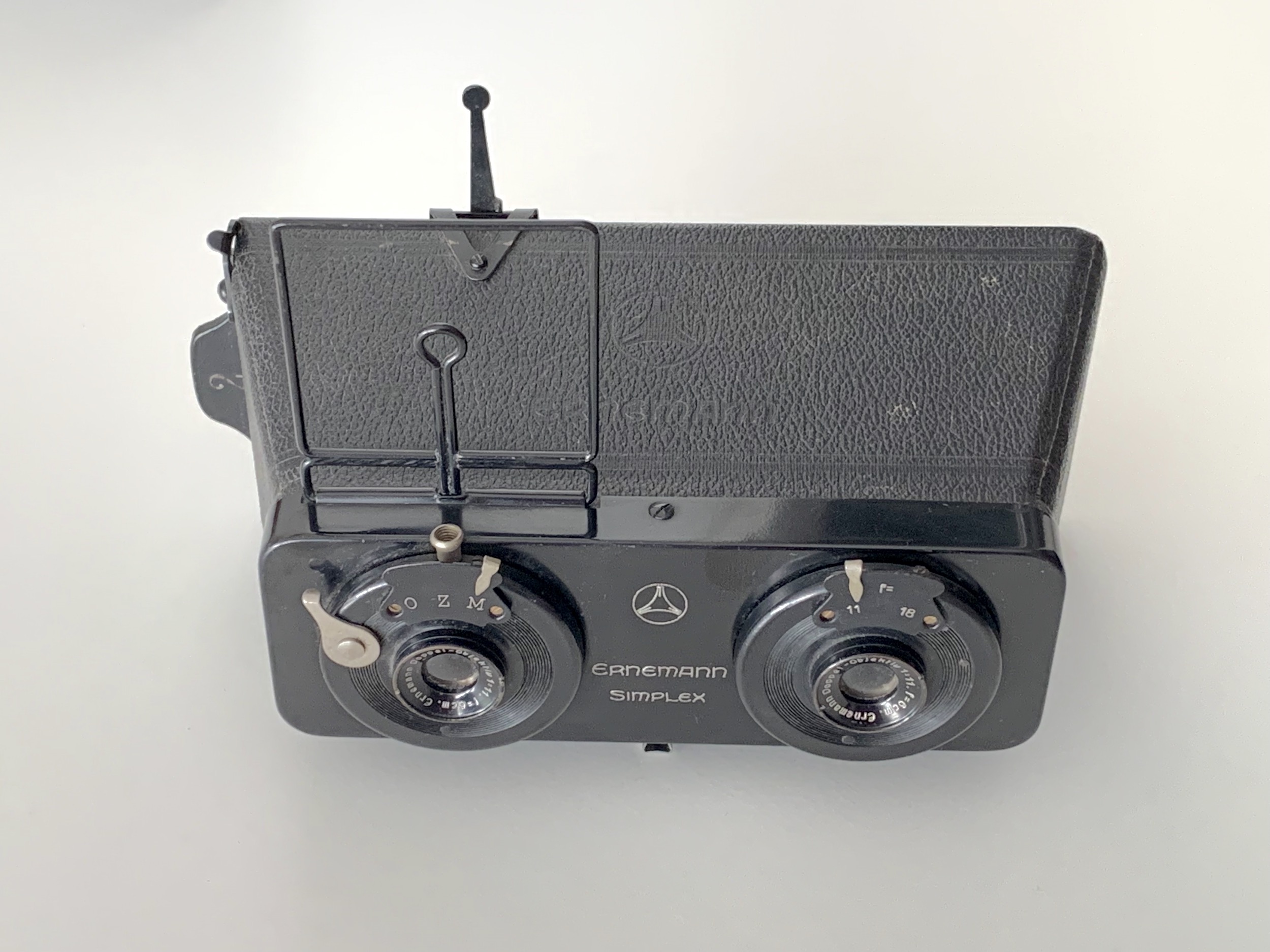 hier eine weitere einfache Stereokamera von Ernemann, die Simplex. Im Prinzip ist es eine Stereo-Boxkamera für Platten im kleinen Stereoformat 4,5x10,7. Sie besitzt ein starres Gehäuse mit Stativgewinde. Verbaut sind zwei "Doppel-Objektive" 11/6,0 cm mit Fixfokus. Der Verschluss bietet eine Momentzeit, O und Z. Bei der Blende kann zwischen Offenblende (11) und 18 gewählt werden. Visiert wird über einen aufklappbaren Rahmensucher. Technisch ist die Kamera anspruchsvoller als die gestern vorgestellte Liliput, aber es bleibt eine Box. Verkauft wurde sie von 1922 an für 27 RM; sie blieb auch nach der Fusion im Zeiss Ikon-Programm und verschwand erst 1929 vom Markt.