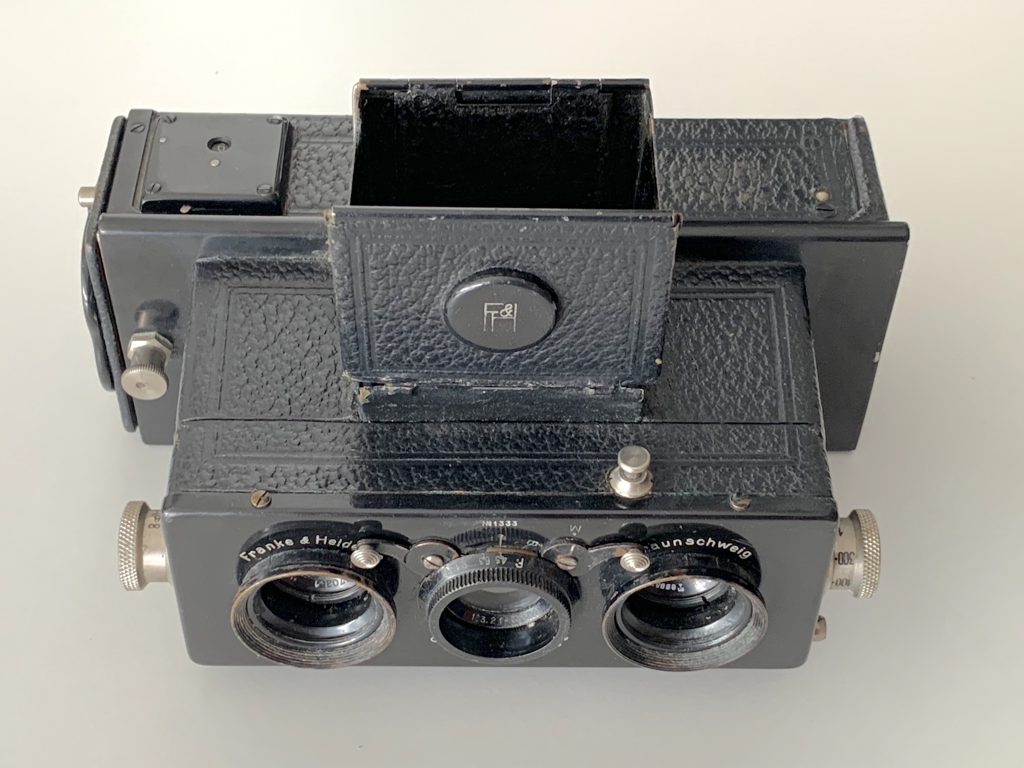 hier soll das erste Produkt der Fa. Franke und Heidecke vorgestellt werden, die Stereokamera Heidoscop im Format 4,5x10,7. Diese Kamera kam im Jahr 1921 auf den Markt. Heidecke war zuvor bei Voigtländer beschäftigt und an der Entwicklung des Stereflektoskops beteiligt gewesen. Seine eigene Stereokamera weist daher eine gewisse Ähnlichkeit mit dem Voigtländer-Modell auf, es gibt aber eigene technische Lösungen, die Claus Prochnow im Rollei-Report ausführlich darstellt. Hier das erste Modell, gebaut 1921–1926: