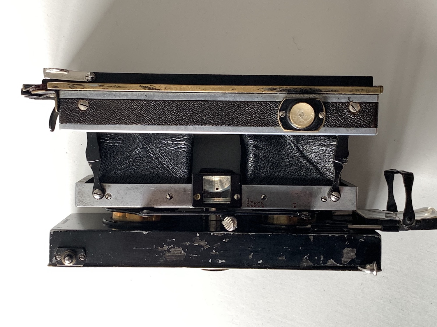 Das gezeigte Exemplar ist nicht mit Wechselkassette ausgestattet, sondern hat einen Adapterrahmen, in den Einzelkassetten und Mattscheibe eingeschoben werden können. Verwendung einer Kassette wäre möglich.